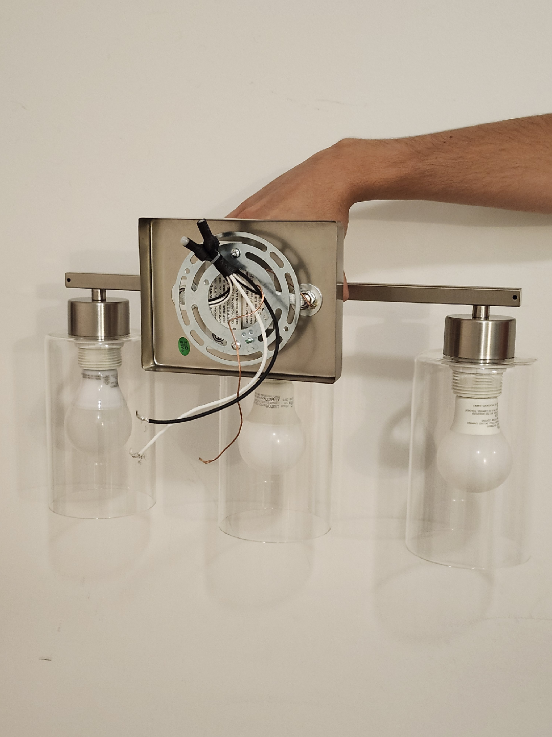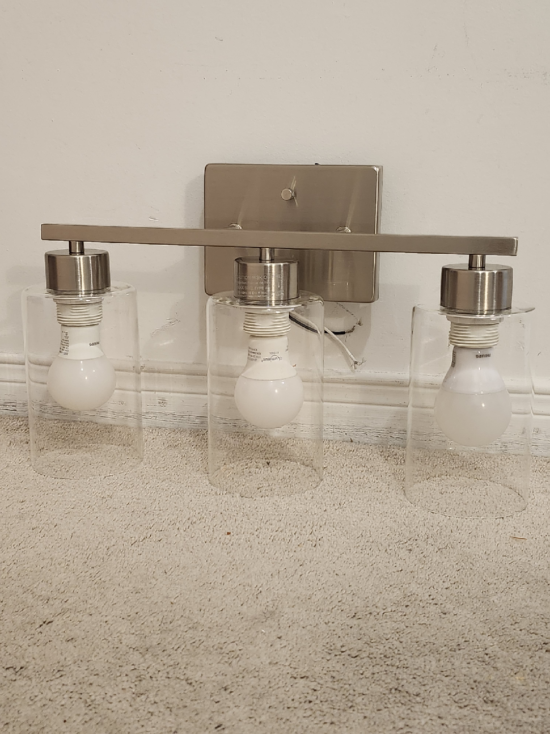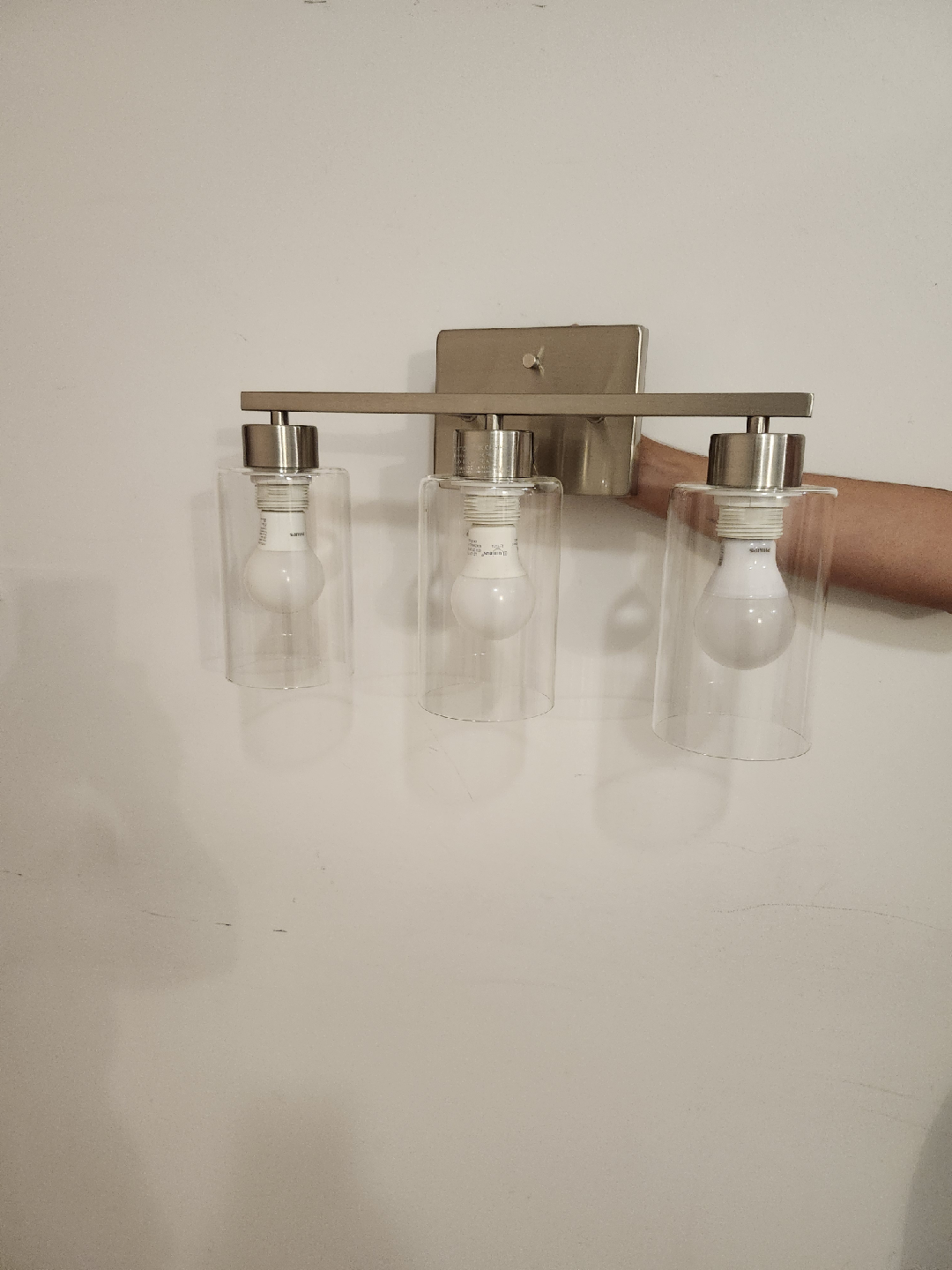 Selling a stylish 3-light bathroom vanity light fixture. It features a modern design with clear glass shades and a brushed nickel finish. It would be a great addition to any bathroom!