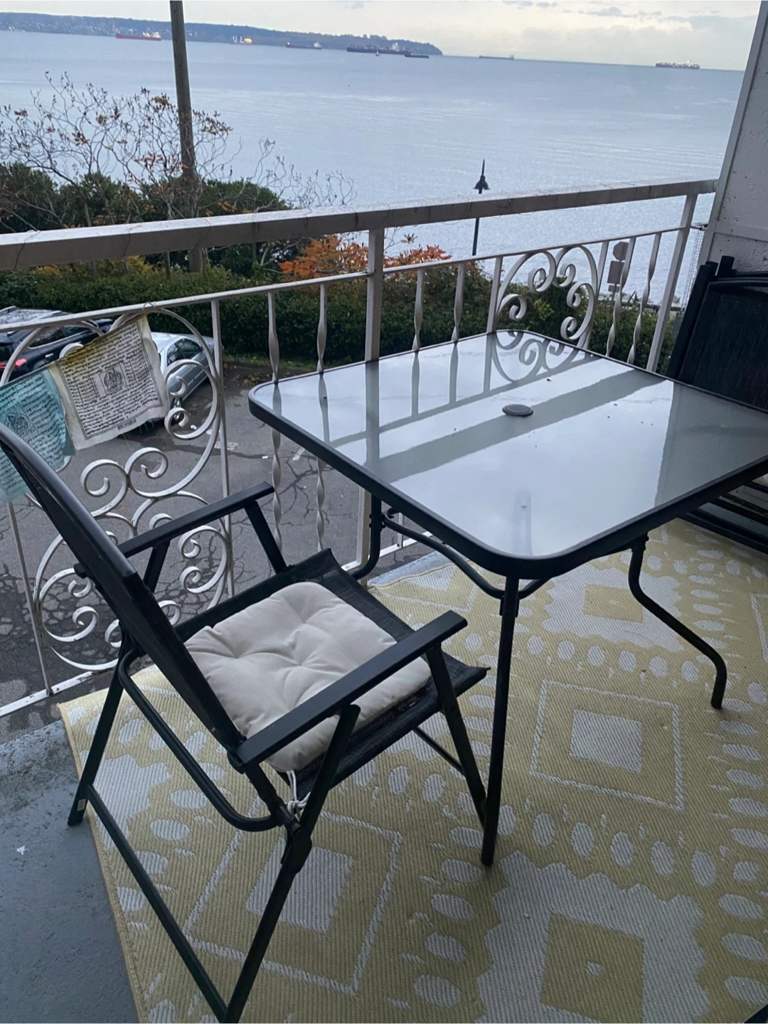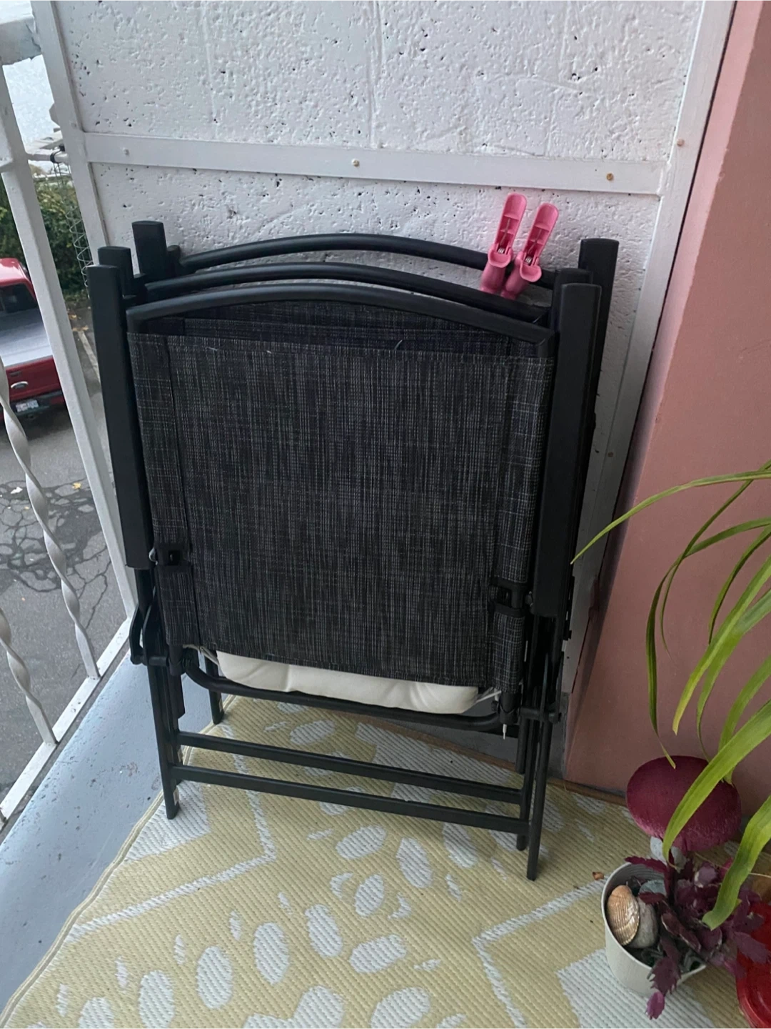Selling an outdoor table and folding chair set in black. It's perfect for patios or balconies. It's in good condition but does have a few paint marks that can come off with some elbow grease. Black umbrella included, never used. Pick up only.