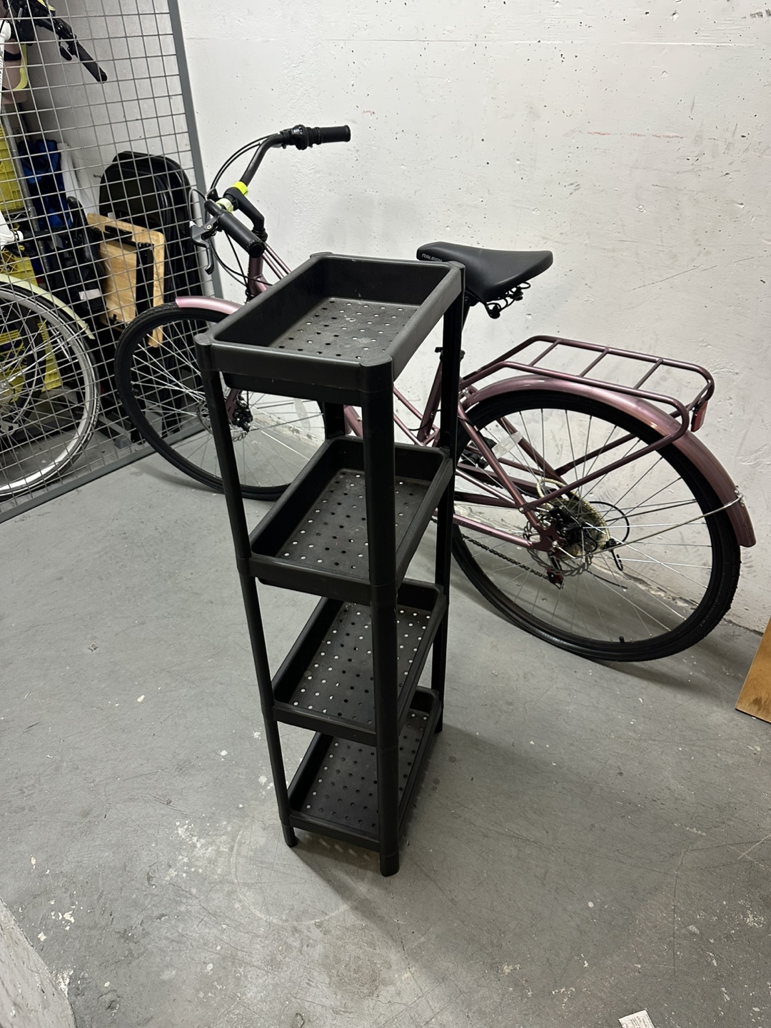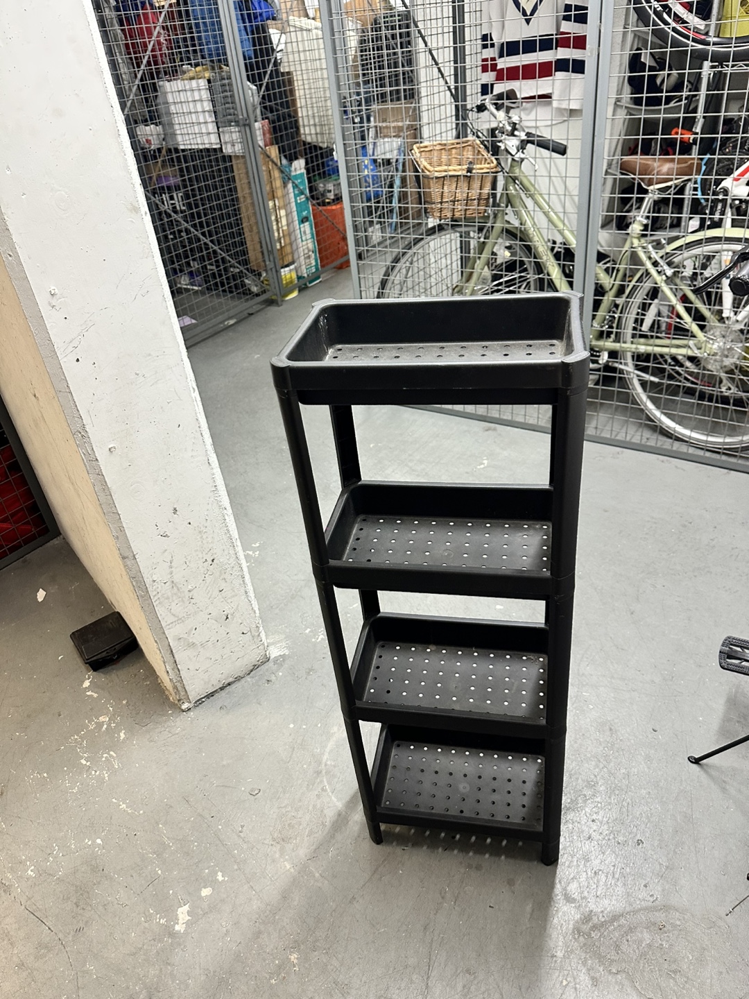 This is a handy black 4-tier rolling storage cart, perfect for organizing various items! It's in great condition and ready to help declutter your space