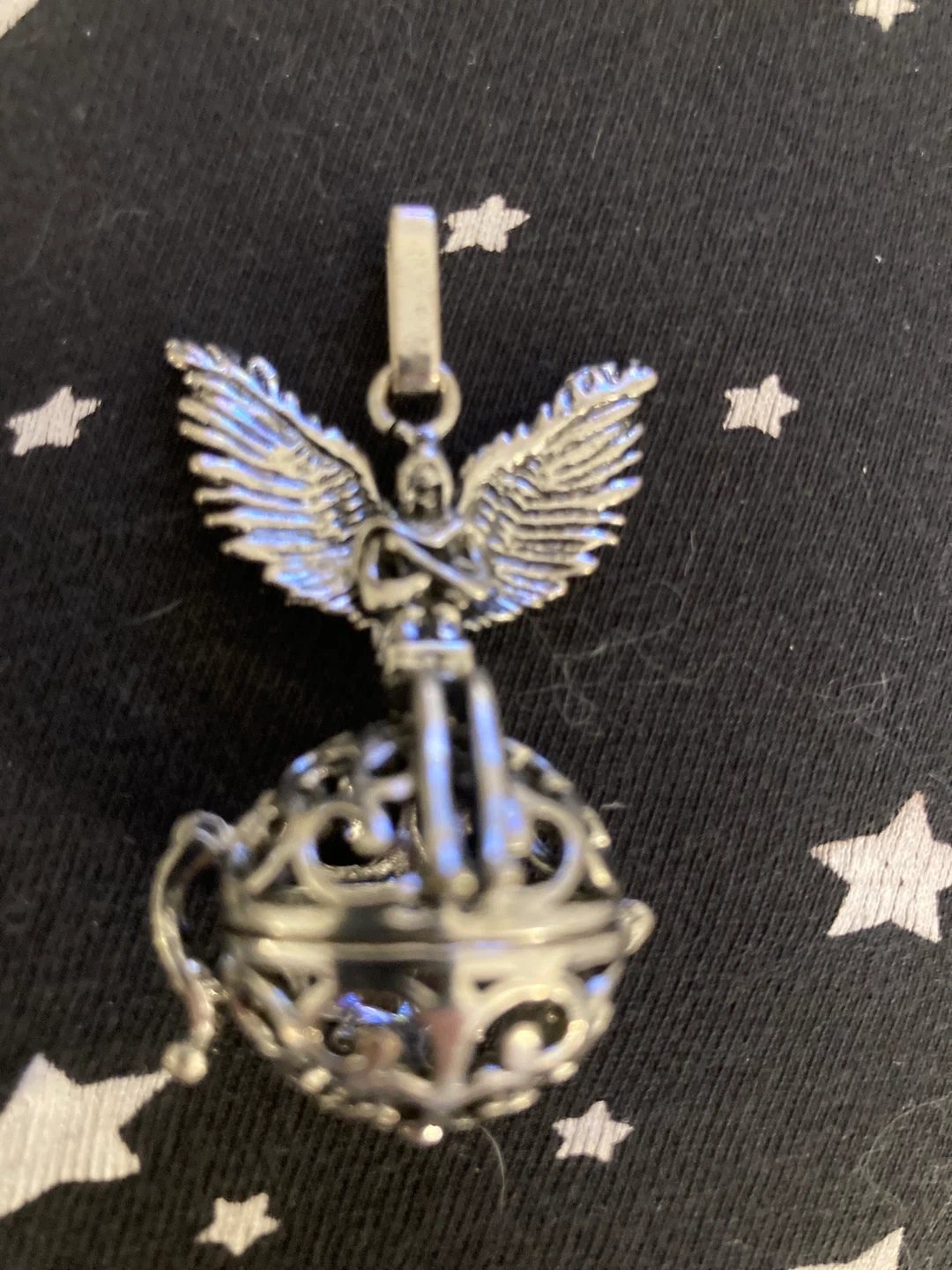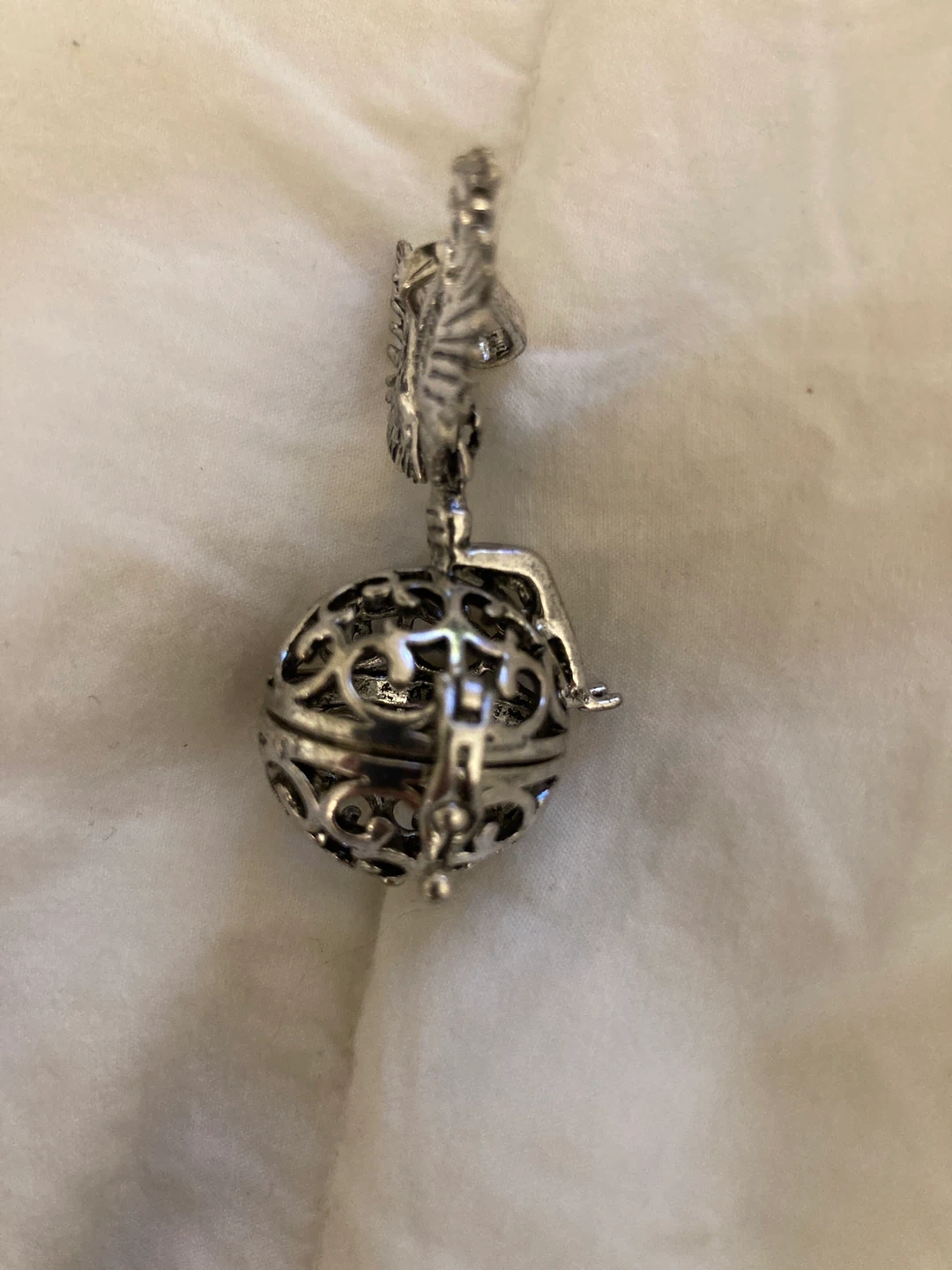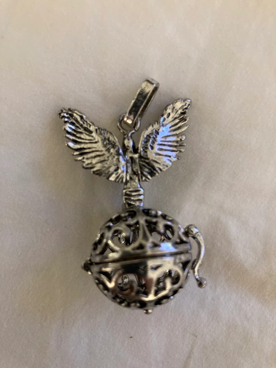 186This is a lovely harmony ball pendant featuring an angel with wings. It's a beautiful piece of jewelry that would make a great addition to any collection! The pendant is in excellent condition and has a unique, eye-catching design