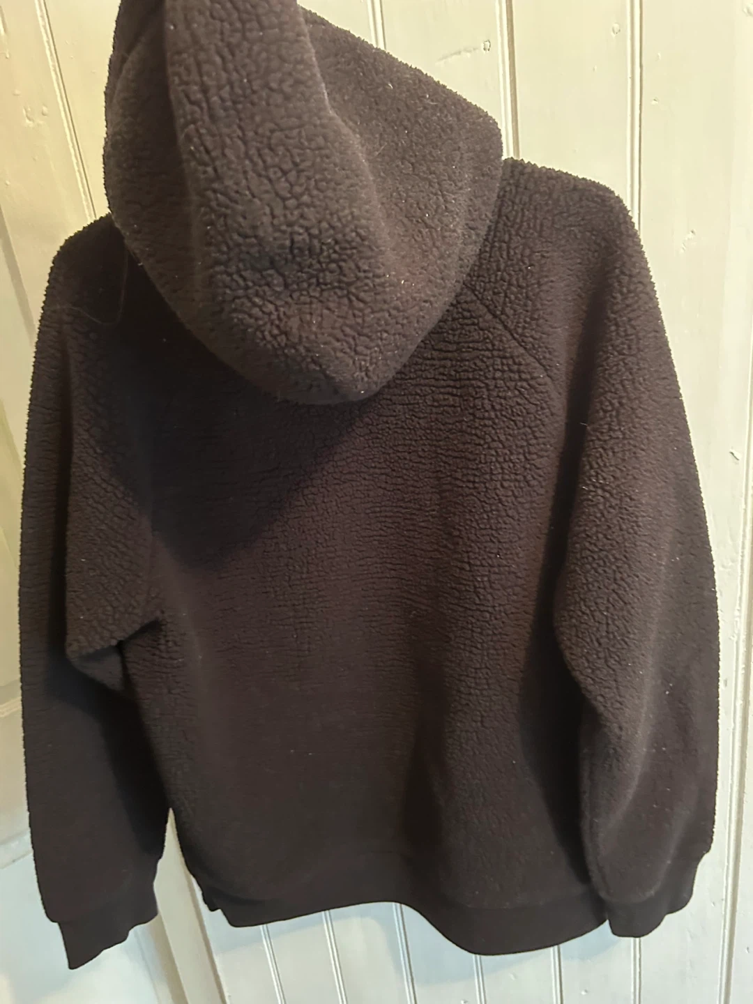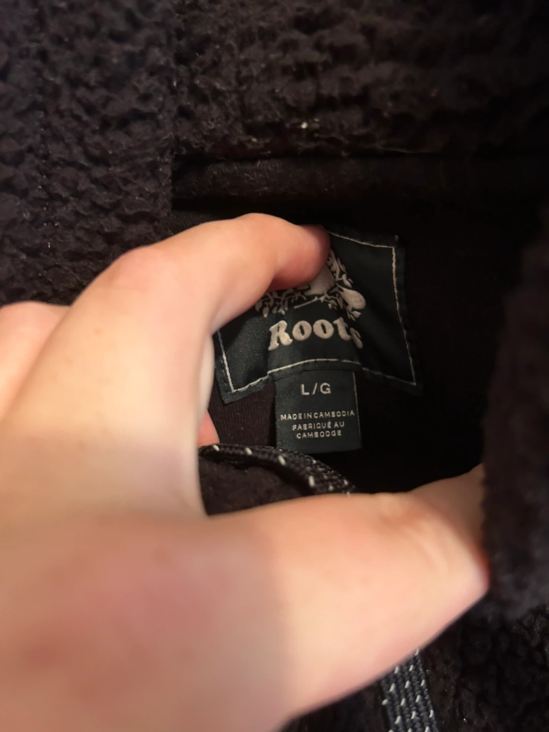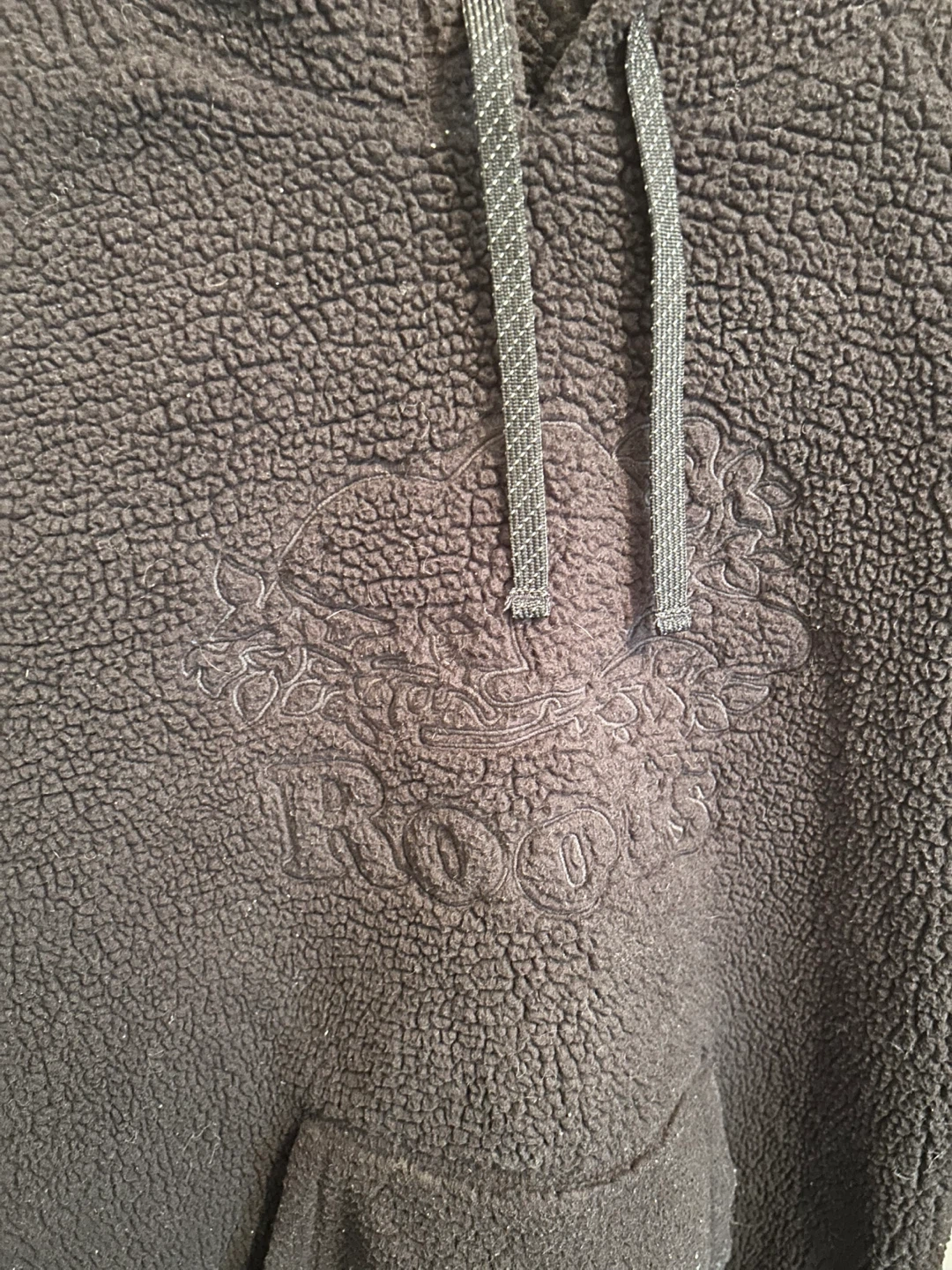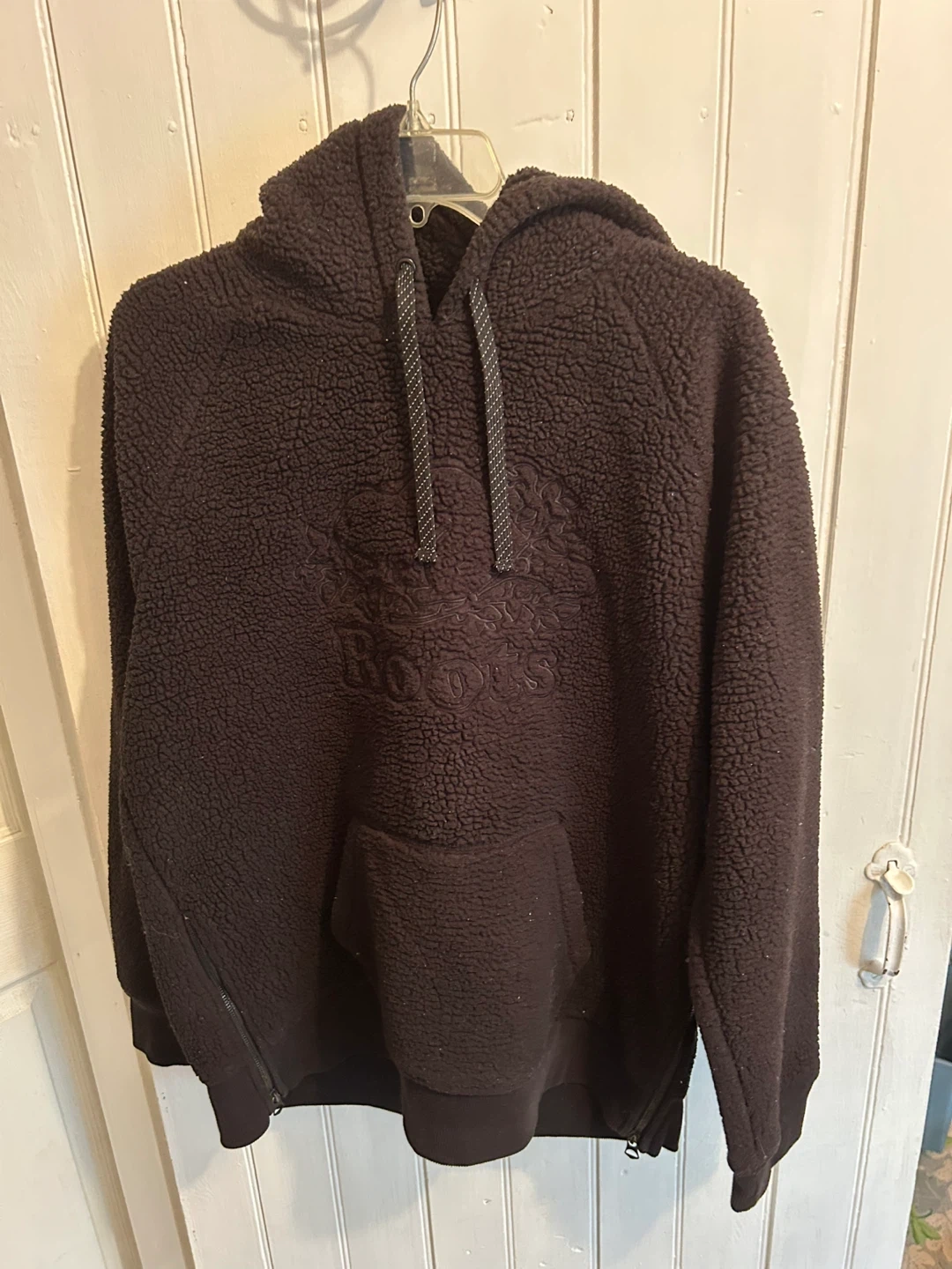 Roots brand. Pullover Sherpa hoodie with side zippers. Black with embroidered logo. Size women’s large. Brand new condition but every fizzy thing sticks to it.