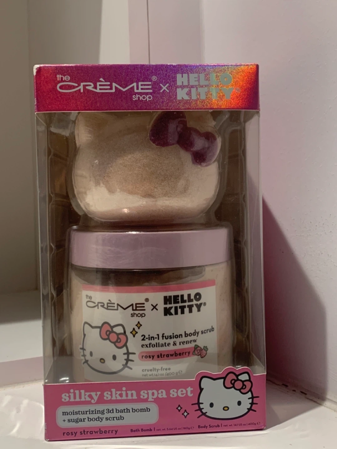Selling a brand new The Crème Shop x Hello Kitty Silky Skin Spa Set! This set includes a moisturizing 3D bath bomb and sugar body scrub in a rosy strawberry scent. Indulge in an at-home spa kit for radiant, silky skin!