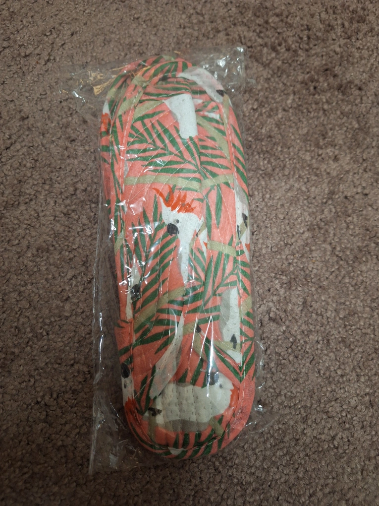 Pick up only. Cute slippers with a tropical print! These are perfect for padding around the house. They feature a fun design with leaves and birds on a coral background. The soles have a polka dot pattern for extra grip