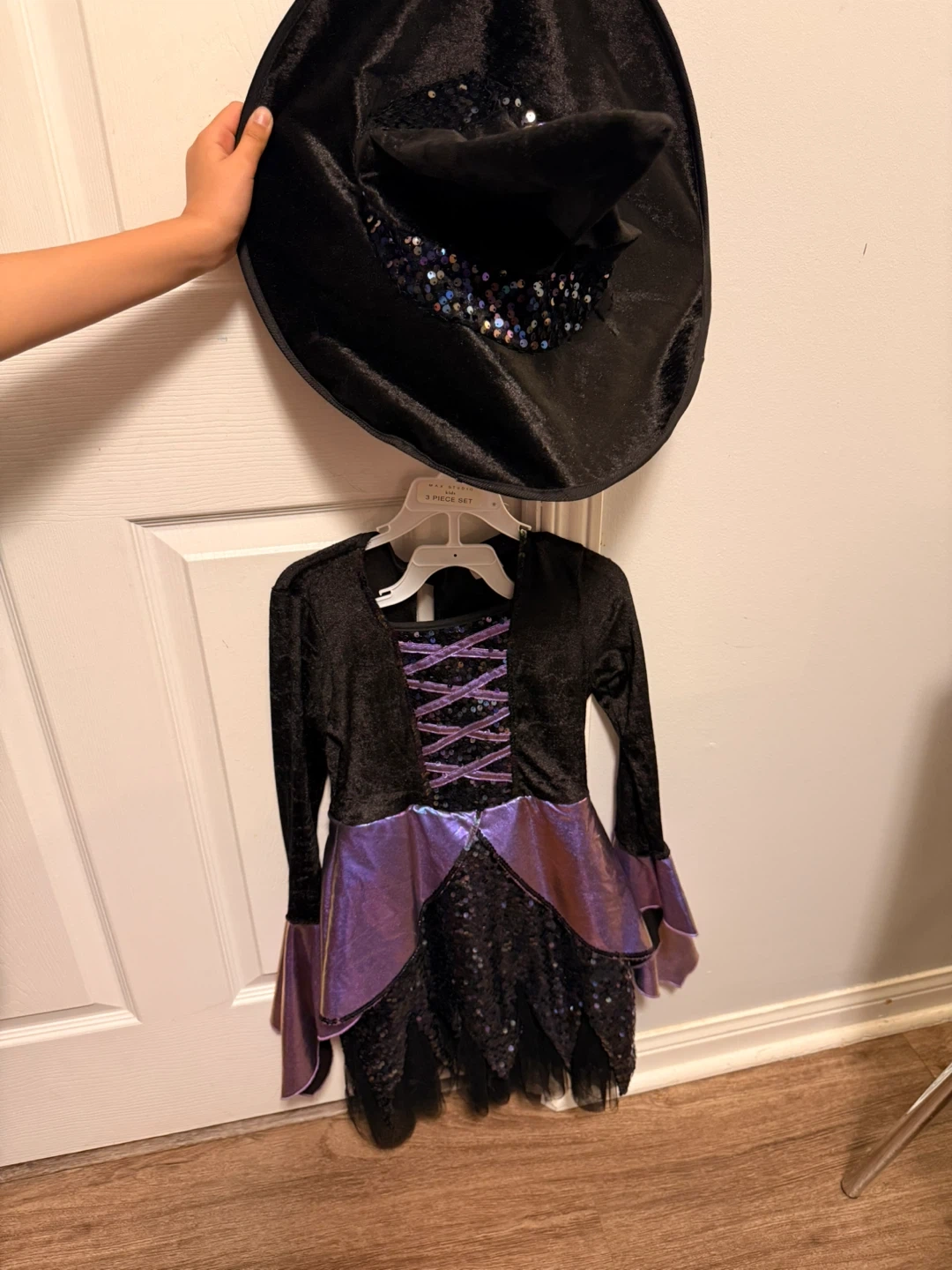 718Cute witch costume, includes hat, dress and leggings. Perfect for Halloween!