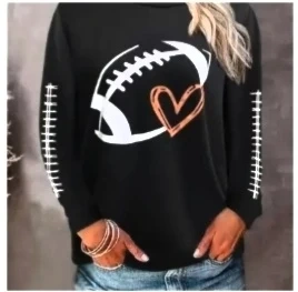 Here's a cute black long-sleeve shirt with a football and heart graphic! It has white stripes down the sleeves. Perfect for fall!