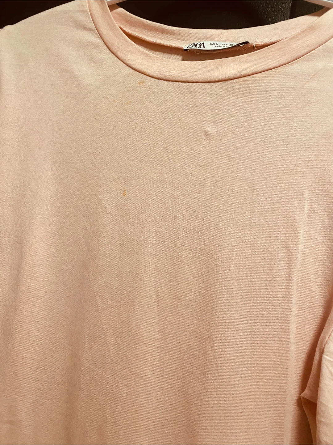 Selling a cute Zara top with puff sleeves! It's a light pink colour and in size M. There are a couple of small marks on the front, as shown in the photos, but otherwise it's in good condition!
