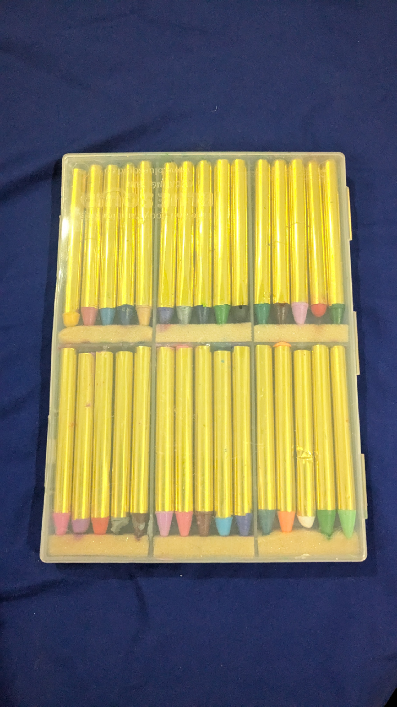 Face Crayons! These crayons have a unique metallic finish that adds a special touch to your artwork. They're perfect for various art projects and come in a convenient case for storage and organization