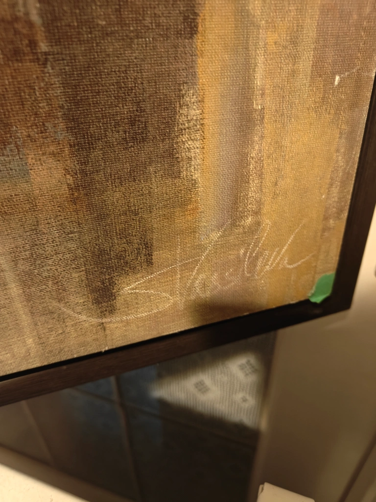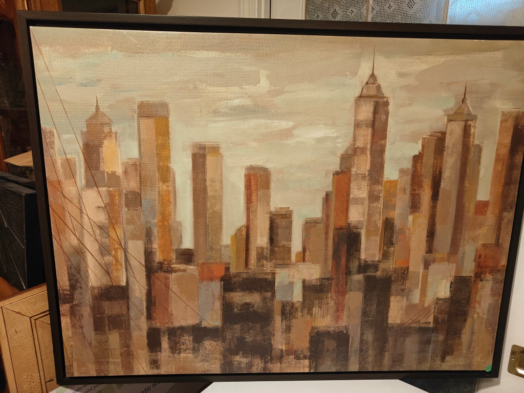 16Selling a framed cityscape painting. It has a modern, abstract style with various shades of brown and beige. Would look great in a living room or office!