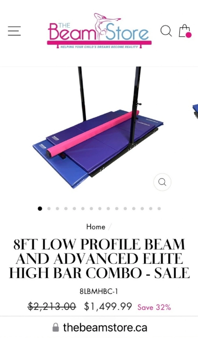Selling a gymnastics beam and high bar combo from The Beam Store. This is the 8FT Low Profile Beam and Advanced Elite High Bar Combo with one mat. Retails for $1,499.99! asking $390. obo