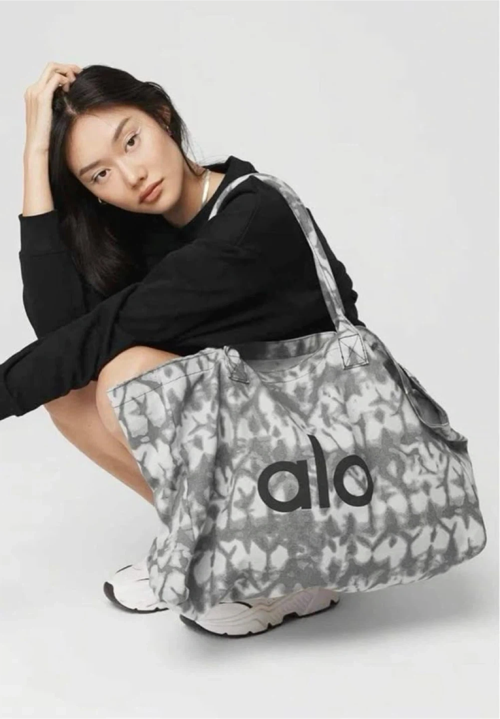 Looking to sell this ALO Yoga tote bag! It features a stylish grey and white tie-dye pattern. Perfect for carrying your yoga essentials or for everyday use
