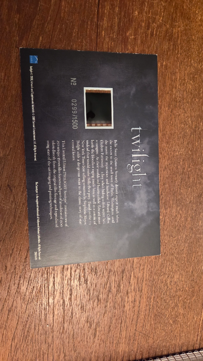 Selling a limited edition Twilight film cell. This cell is part of a limited run of 1500. A unique item for fans of the original film, featuring a piece of the actual footage! The cell is number 0299/1500.