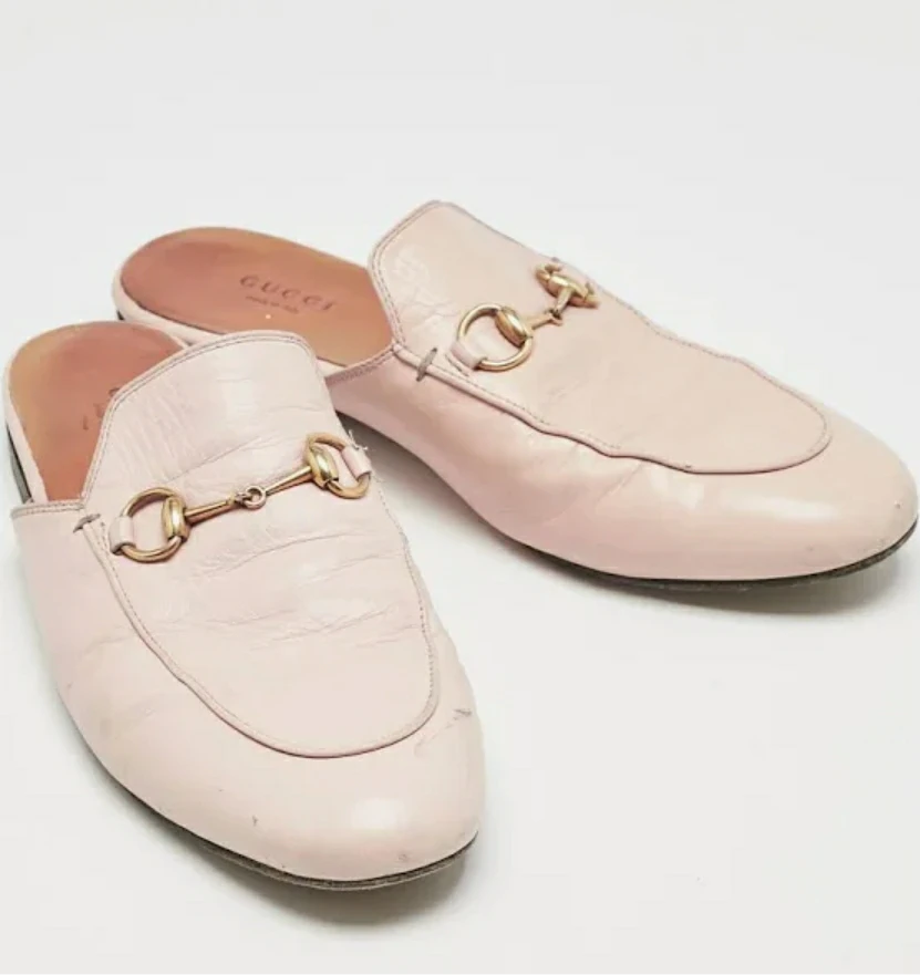 GUC light pink leather iconic gucci mules. Have been resoled and annoyingly, the cobber adhered them over most of the "gucci" on the underside (refer to pics)--price reflects this. Some minor scuffs at toe but otherwise good condition. size 36.5, fits 7 US.