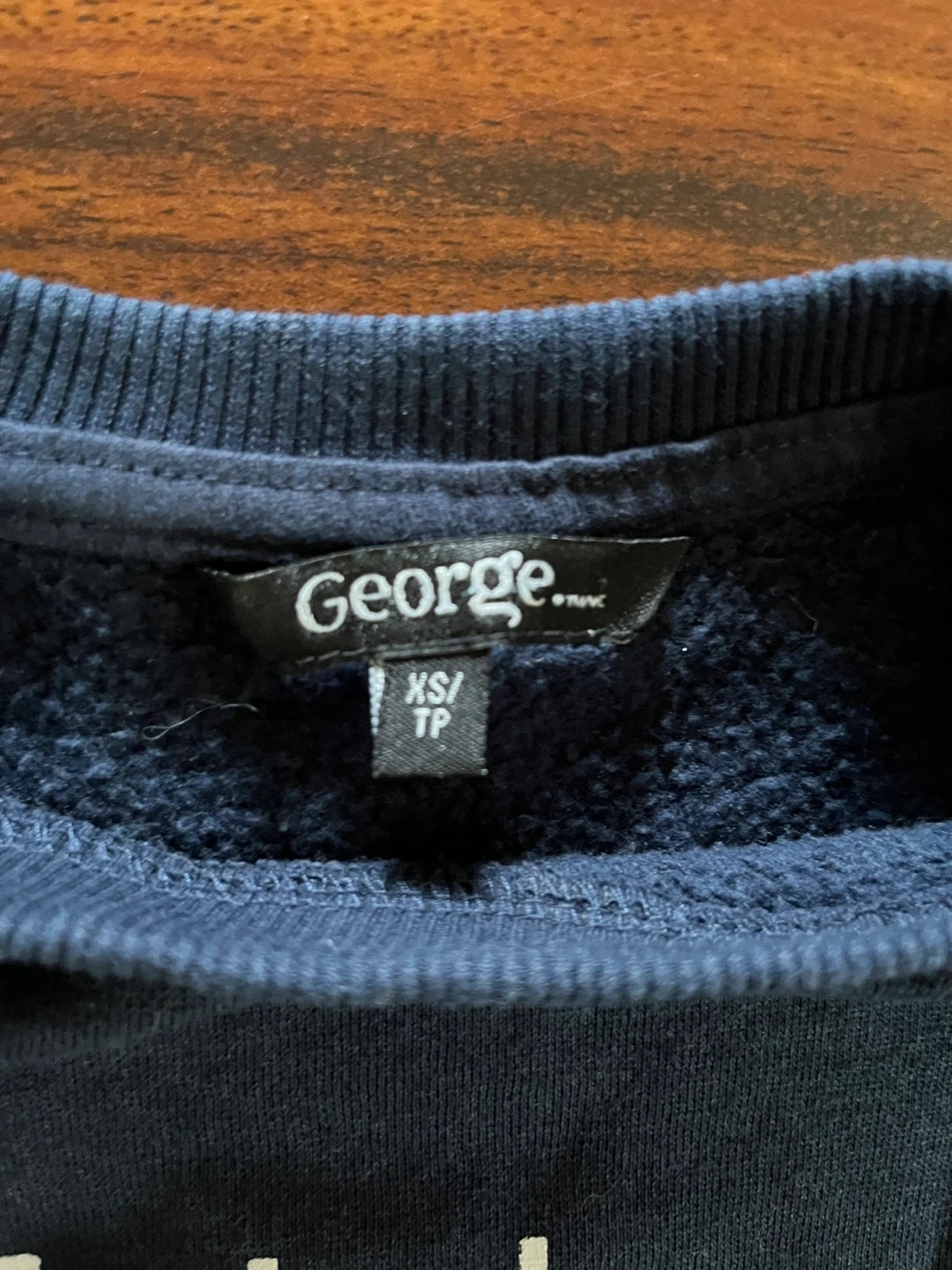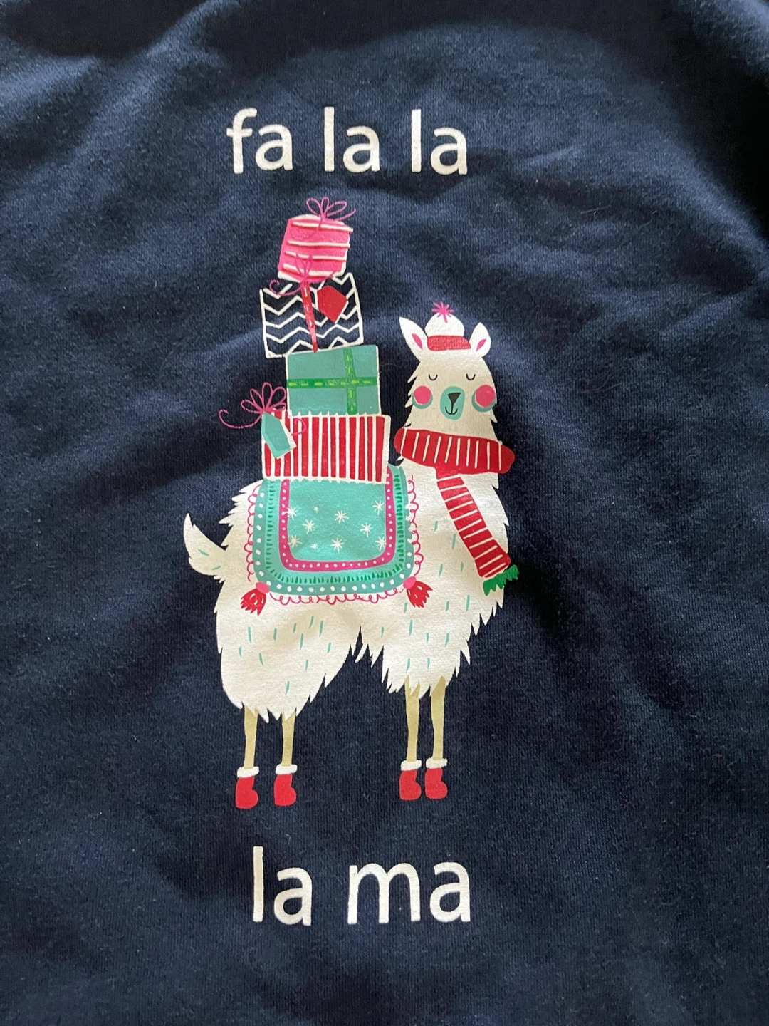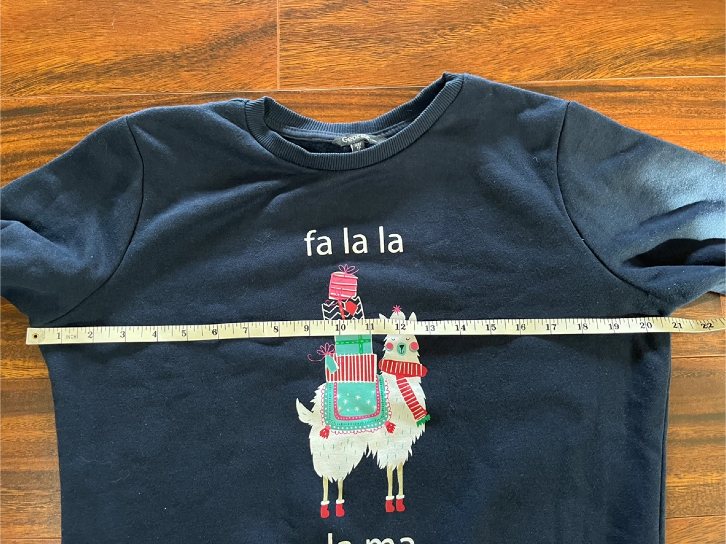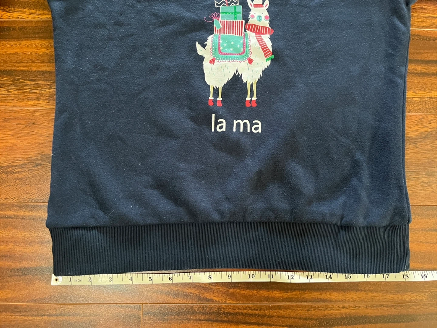 Festive George navy sweatshirt for women, size extra small, featuring an adorable llama with ‘fa la la la ma’ text. Excellent condition. Soft cotton blend with ribbed cuffs and hem.