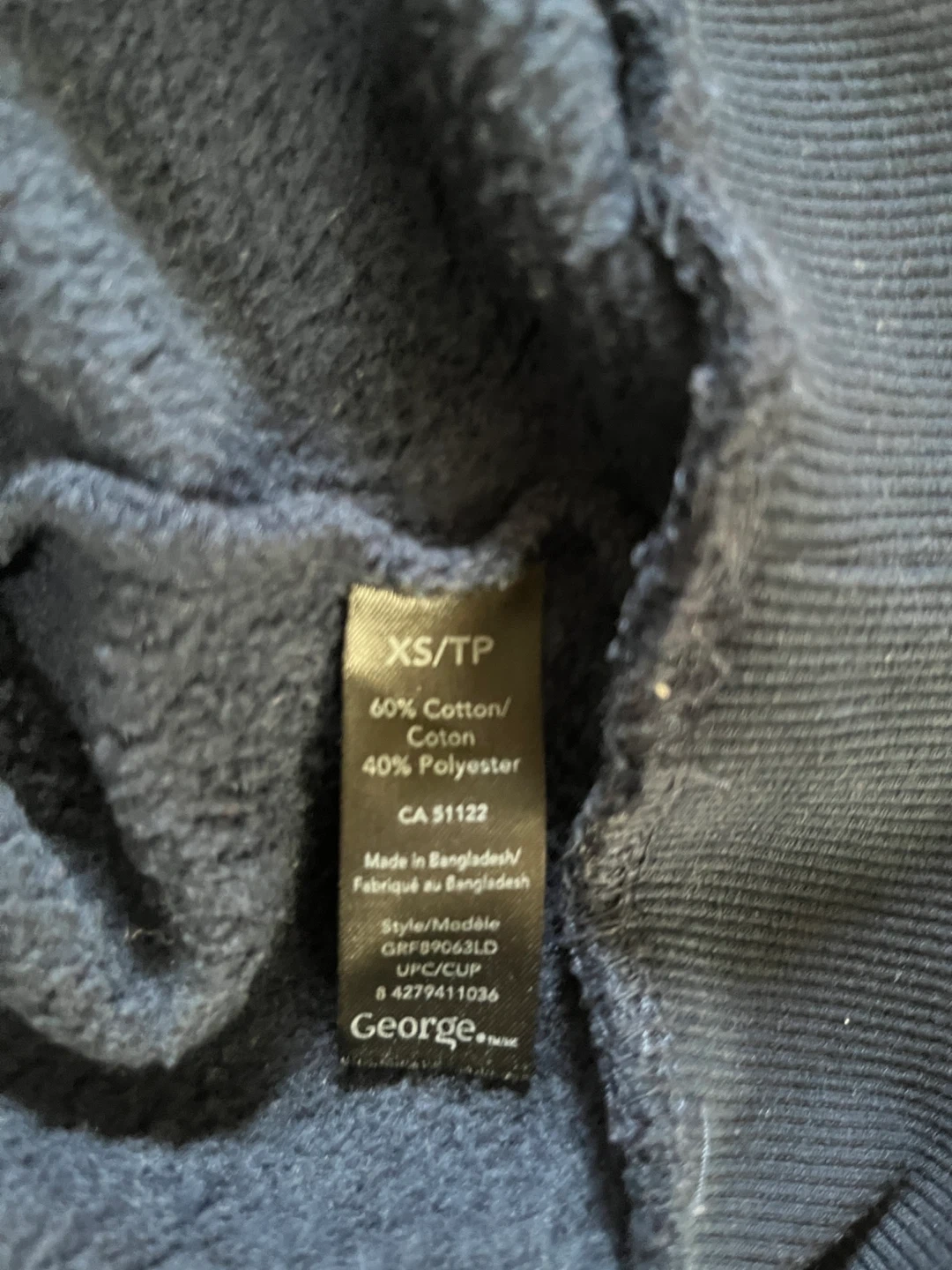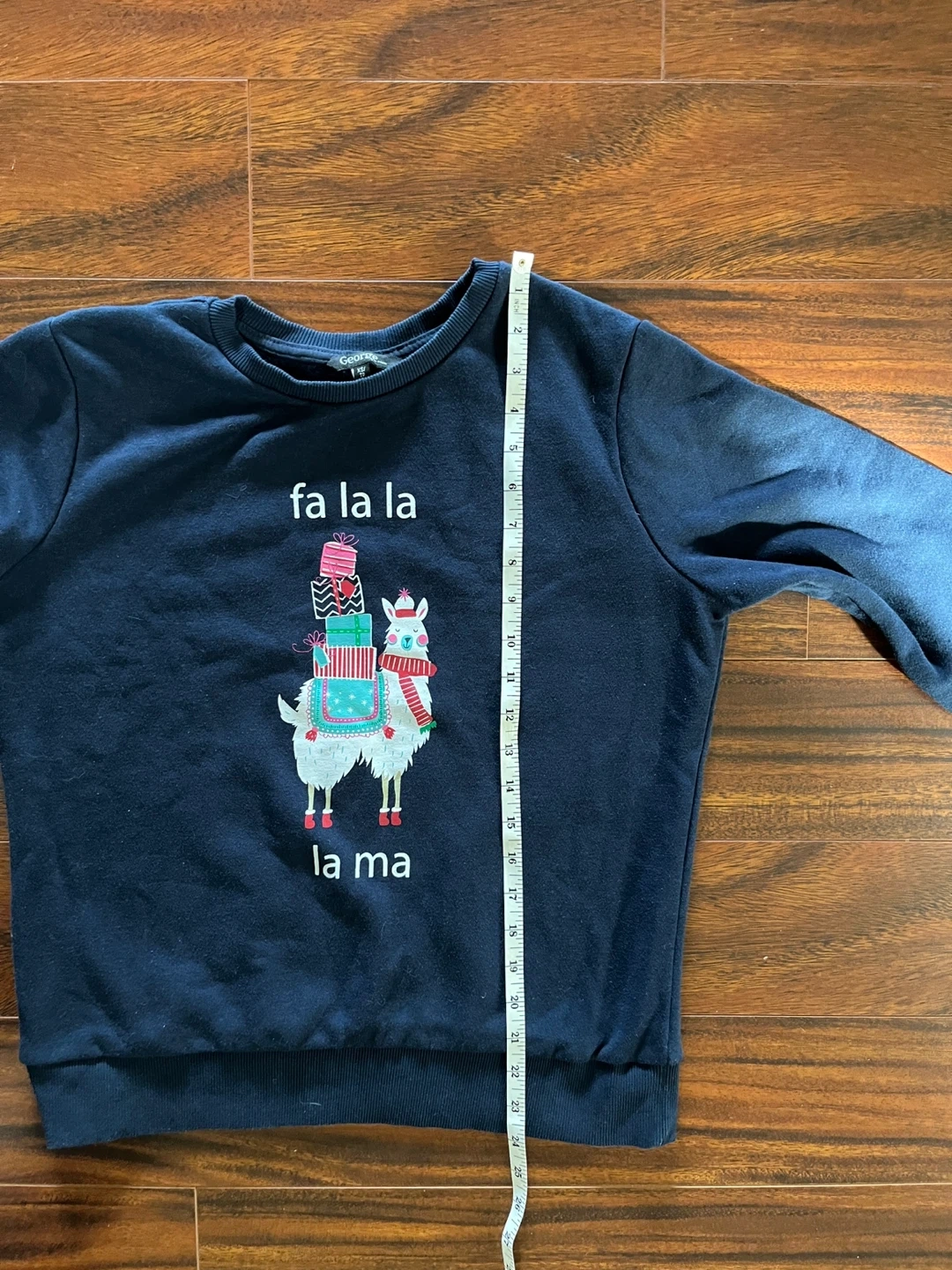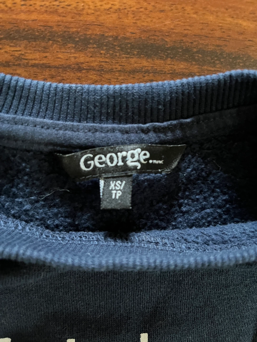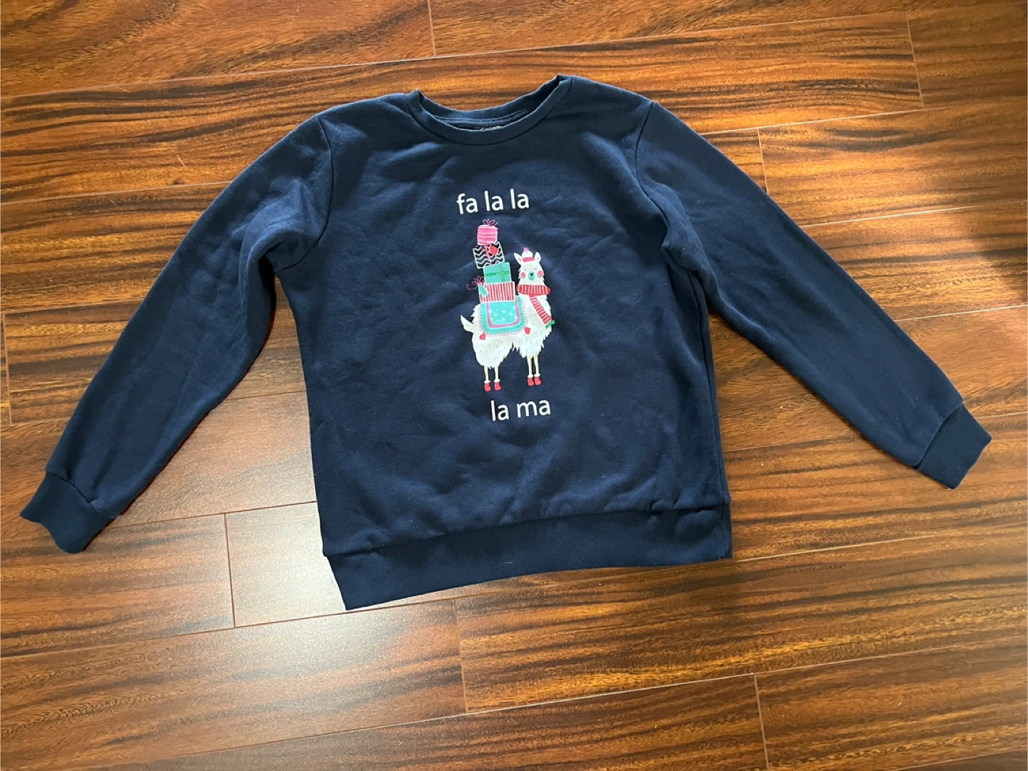 Festive George navy sweatshirt for women, size extra small, featuring an adorable llama with ‘fa la la la ma’ text. Excellent condition. Soft cotton blend with ribbed cuffs and hem.