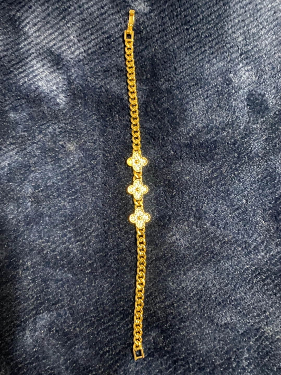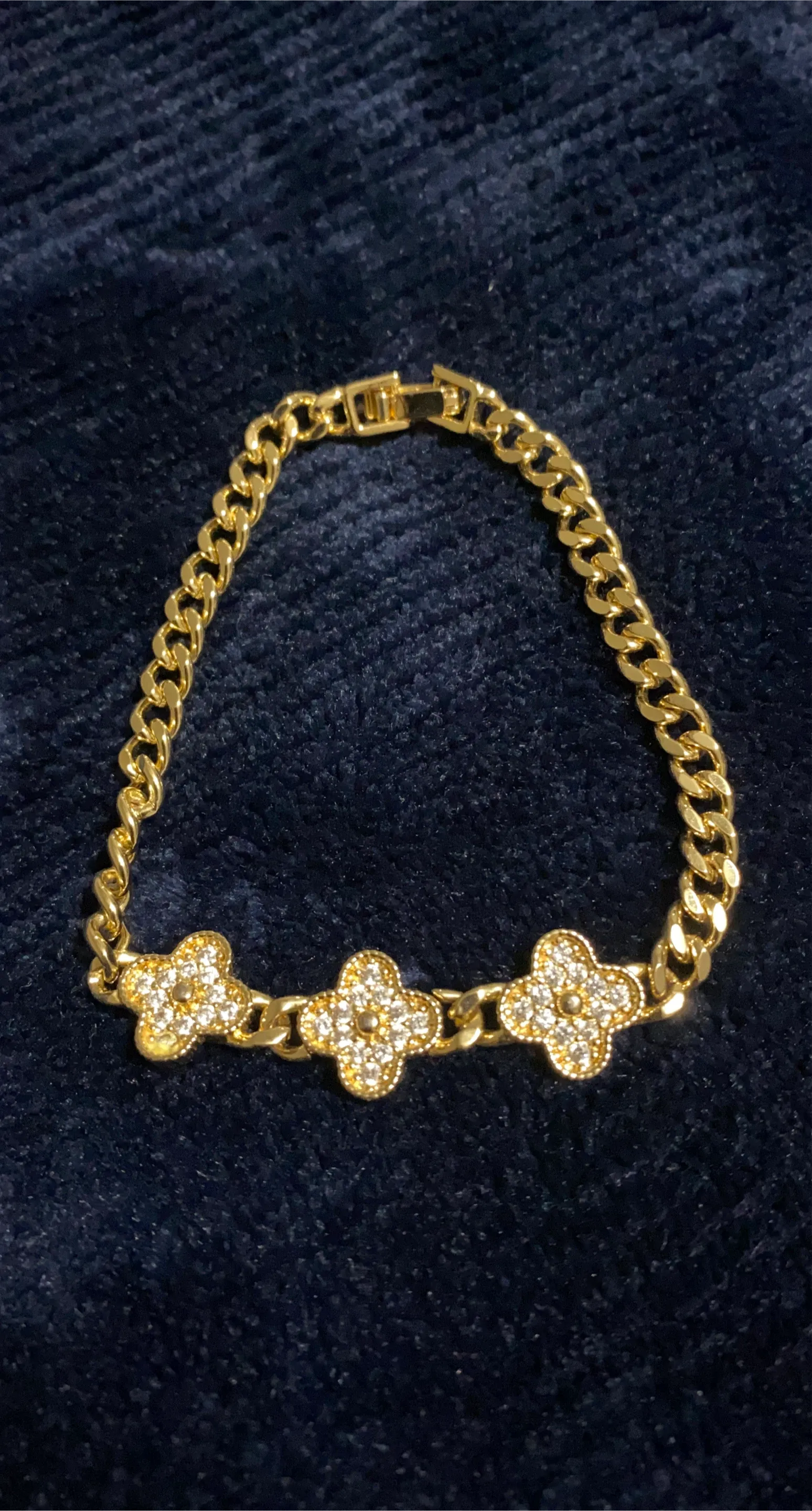 Selling a gold-tone bracelet featuring a chain design and cute clover accents. This stylish piece adds a touch of elegance to any outfit!