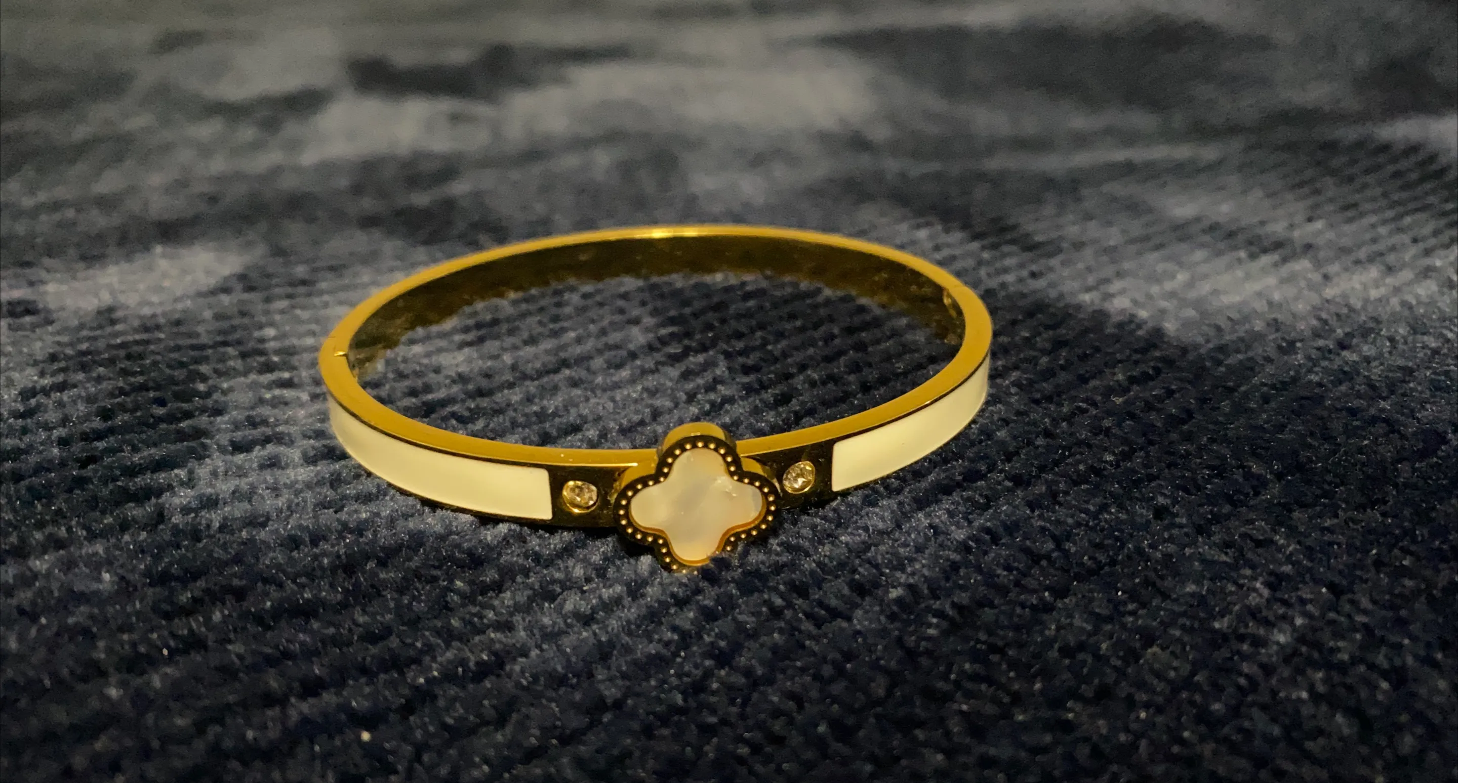 Selling a gold tone bangle bracelet with a clover design. It has a white enamel inlay and a clover charm surrounded with a couple of small stones. It's in great condition and would make a lovely addition to any jewelry collection! Open to offers