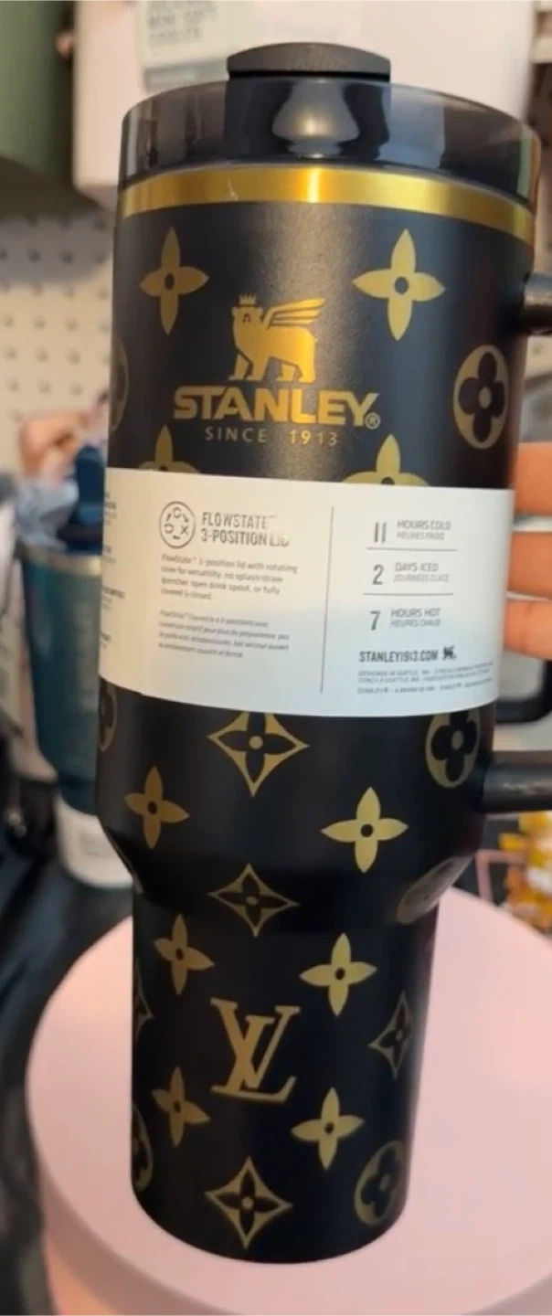 Selling a Stanley tumbler in black with a gold design! It features Stanley's Flowstate 3-position lid. Keeps drinks cold for 11 hours, iced for 2 days, and hot for 7 hours