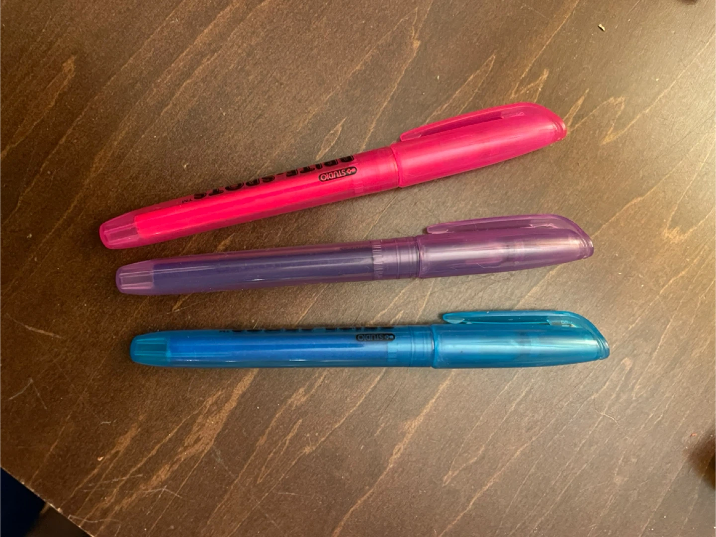 Offering a set of three Studio Bright Spots Highlighters. They're in brand new shape and ready to brighten up your notes!