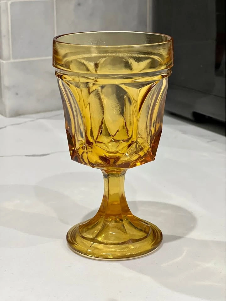 98ANCHOR HOCKING FAIRFIELD Amber 6” Golden Honey Goblet Water Ice Tea Vintage. Condition is Used. Height: 6 in Width: 3 1/4 in Special Characteristics: 8 OZ. Crafted In United States Discontinued Piece
