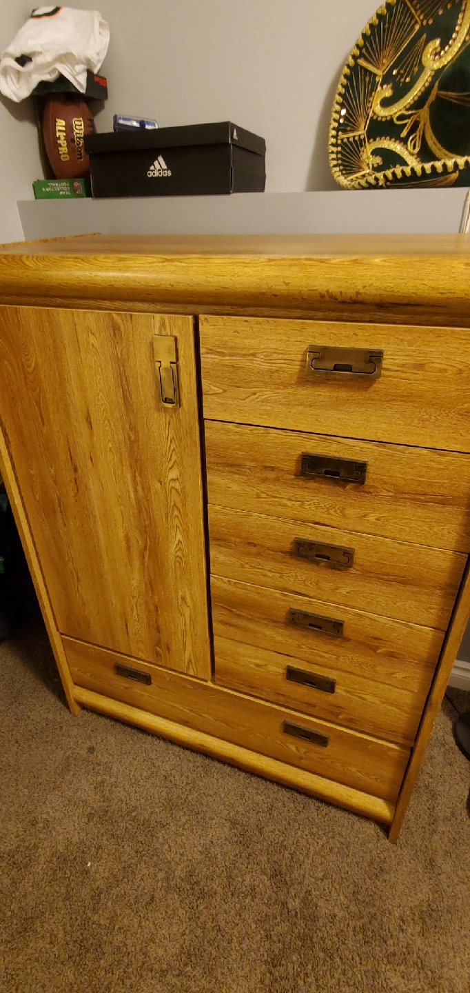 Here's a wooden dresser with a cabinet and several drawers. It's a great piece for adding storage and style to any room in your home. I'm unable to have it delivered but I can help you move it out of my house.