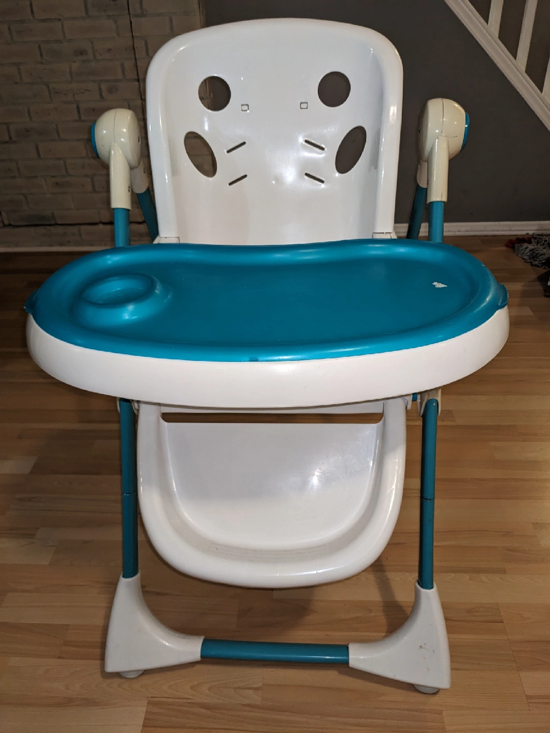 240Selling a baby high chair in white and blue. It's in used condition with wear and tear, including a crack on one of the arm supports. The leg hinges have cracked and not as steady. Please repair and reuse or resell.