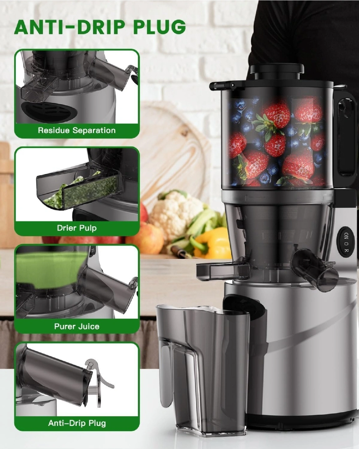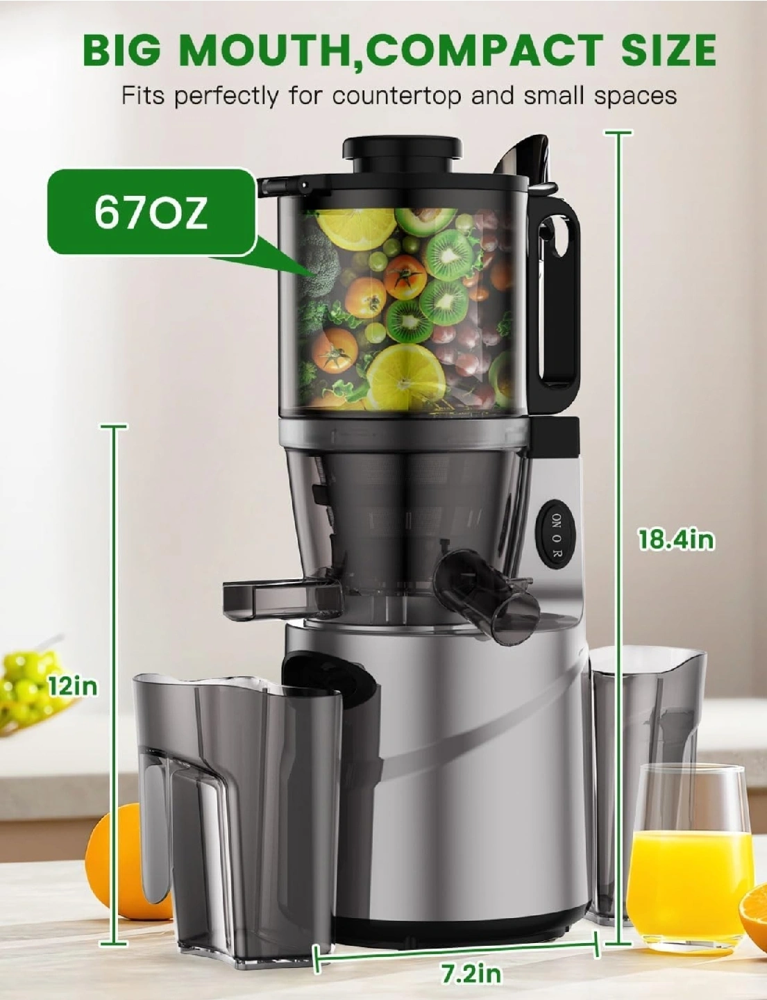 It also has an anti-drip plug and residue separation for purer juice. Big mouth, compact size fits perfectly for countertops and small spaces!