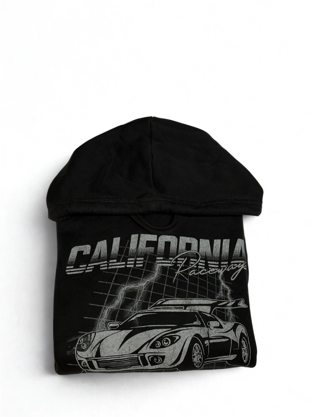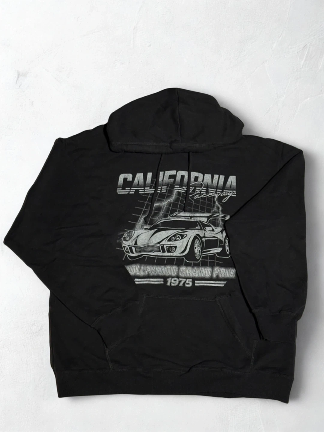 15Selling a black hoodie with a California Racing design. It features a cool graphic of a race car and the text "California Racing Hollywood Grand Prix 1975". The hoodie is in great condition and perfect for car enthusiasts or anyone who loves a stylish, casual look!