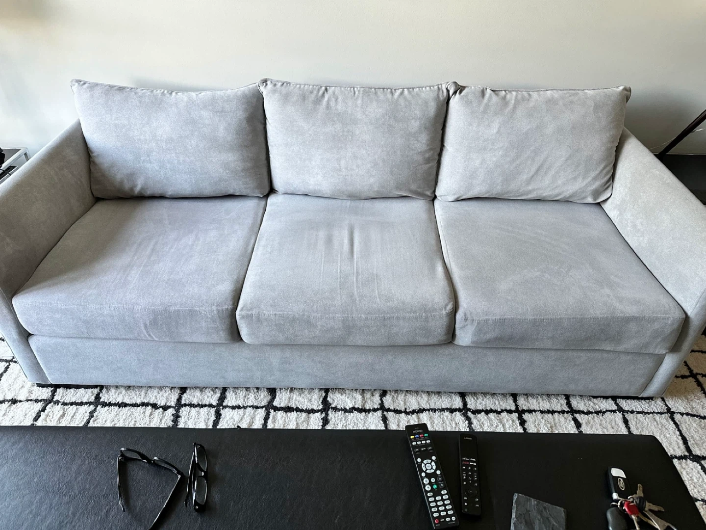 Selling a comfy three-seat sofa in a light grey colour! It’s in great shape and ready for a new home. Perfect for a living room or den