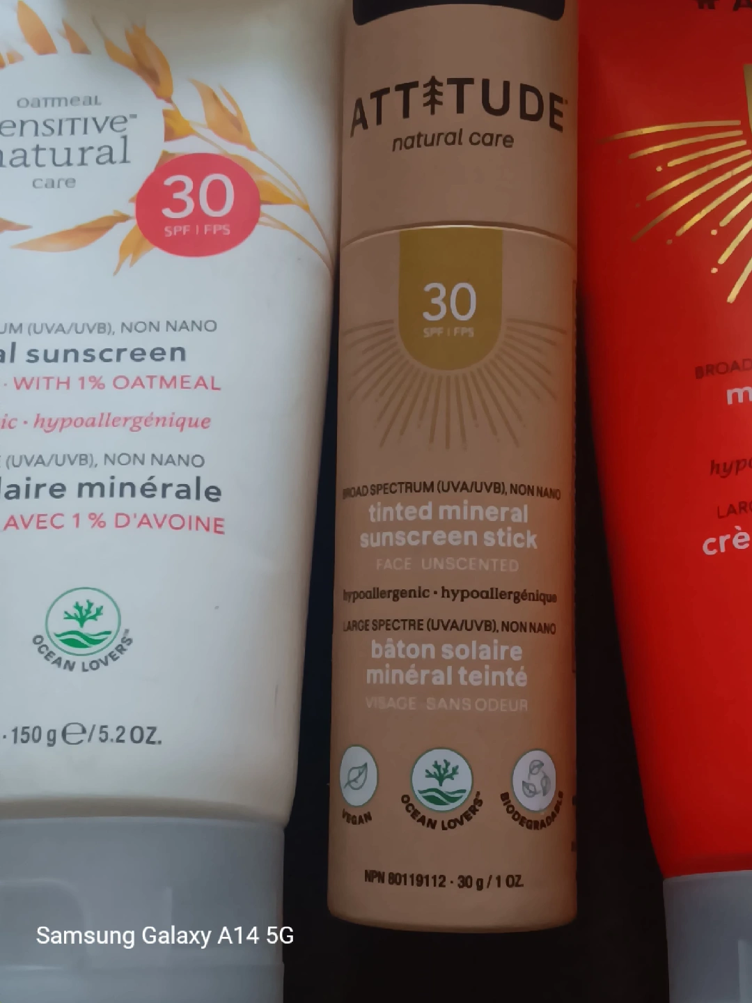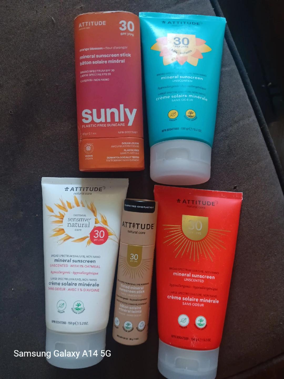 1000+I have a variety of Attitude mineral sunscreens available. They are all SPF 30 and unscented. - Oatmeal Sensitive Natural Care Mineral Sunscreen - Tinted Mineral Sunscreen Stick - Mineral Sunscreen - Kids Mineral Sunscreen They are all broad spectrum (UVA/UVB), non-nano, and hypoallergenic. Vegan and Ocean Lover certified selling all together 10 dollars foe all