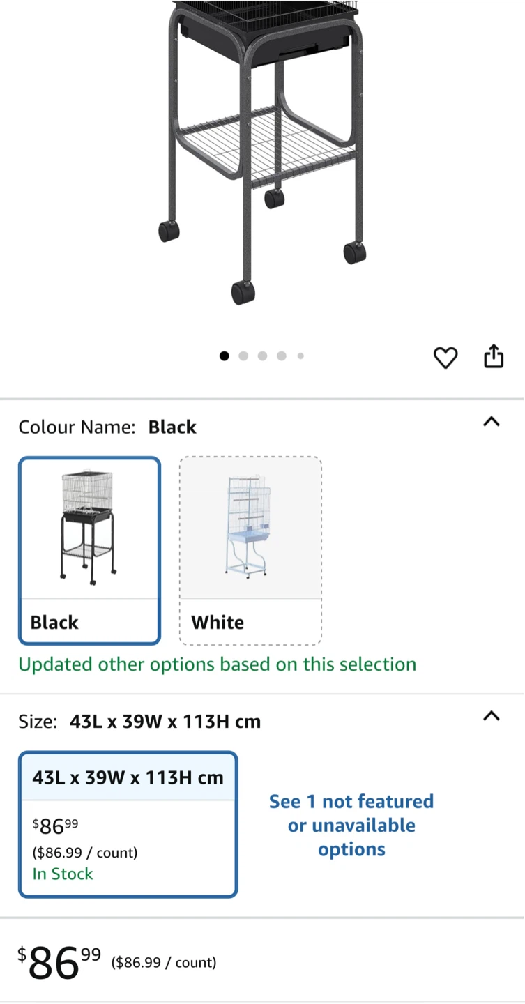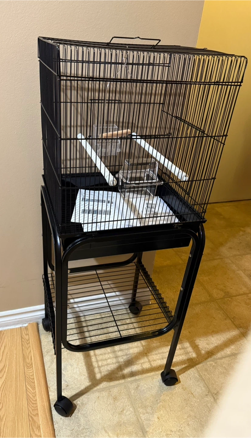 brand new PawHut rolling bird cage with stand! Perfect for budgies, canaries, finches, love birds and so on. All the components and accessories are included like swing, two food dishes, two perches, with plenty of space if more accessories need to be added. Very easy to clean with the pull out tray at the bottom. The cage detaches from the stand in a breeze. The stand has a shelf for storing your pet supplies within your hands reach. It retails for $86.99. Asking $65