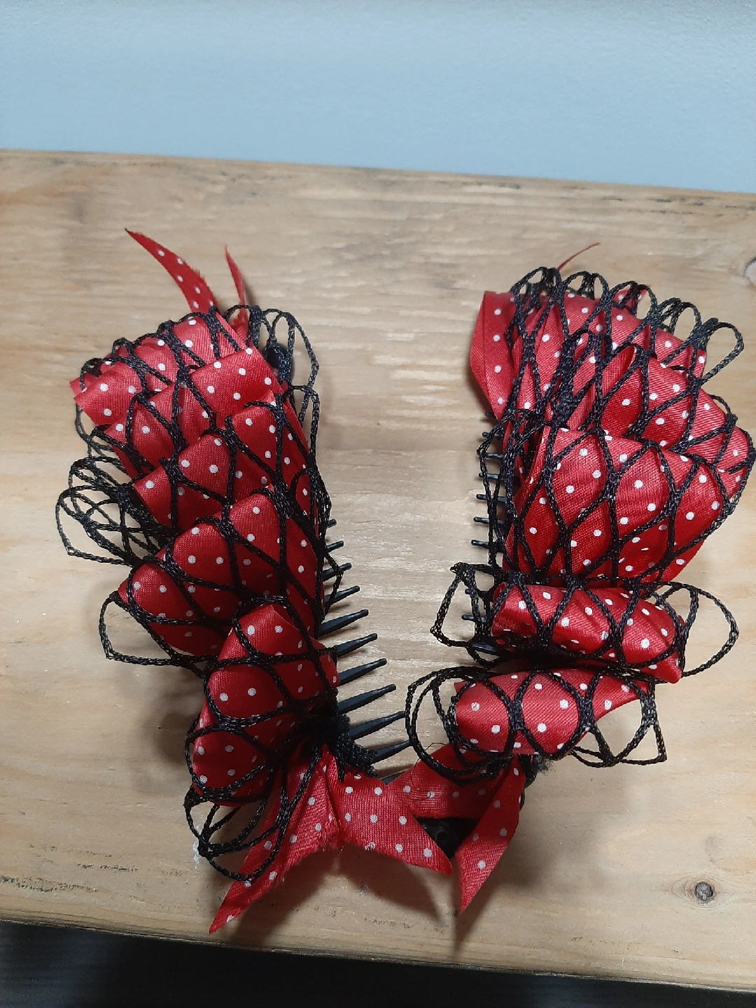 A cute red hair comb with white polka dots and black netting. It's in great condition and ready to add a pop of colour to your hairstyle!