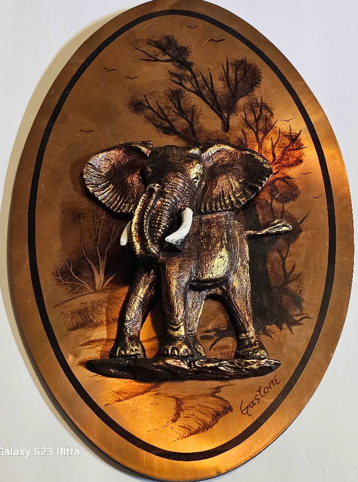 Unique vintage wall art featuring an elephant sculpture .mounted on an oval anodized cupper with hand pained nature The piece is signed "Gastone" and has a lovely reflection of bronze and gold colour scheme. Perfect for adding a touch of character to any room!