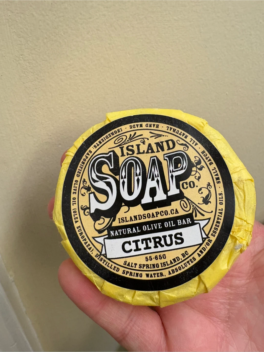 Island Soap Co. Citrus natural olive oil bar from Salt Spring Island, BC. It weighs between 55-65g and is wrapped in yellow paper