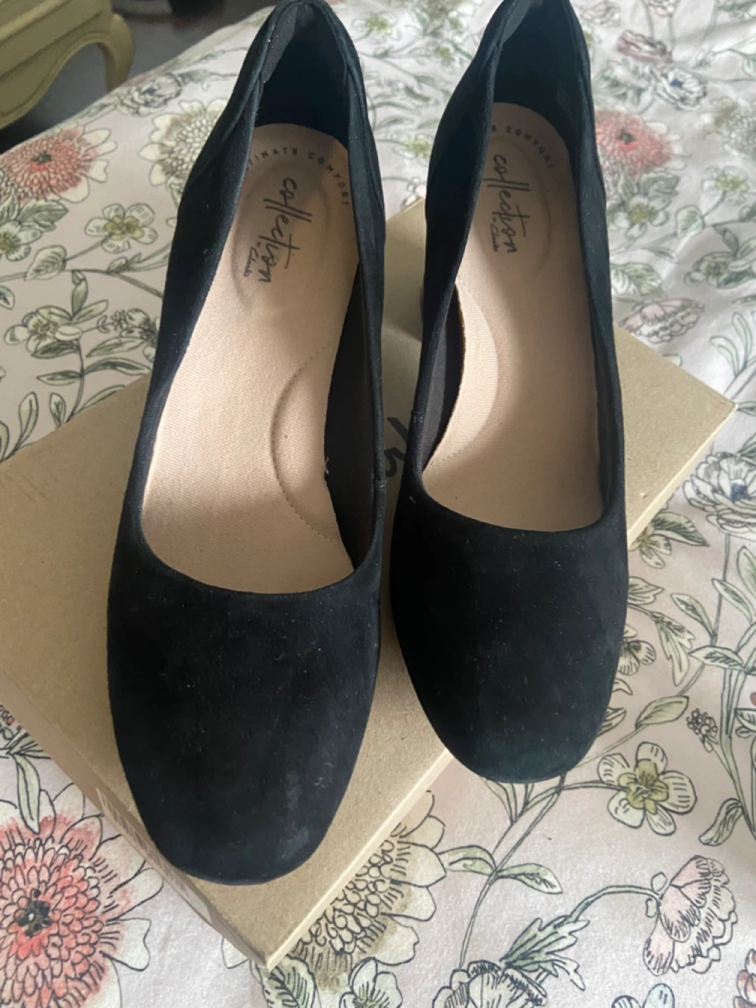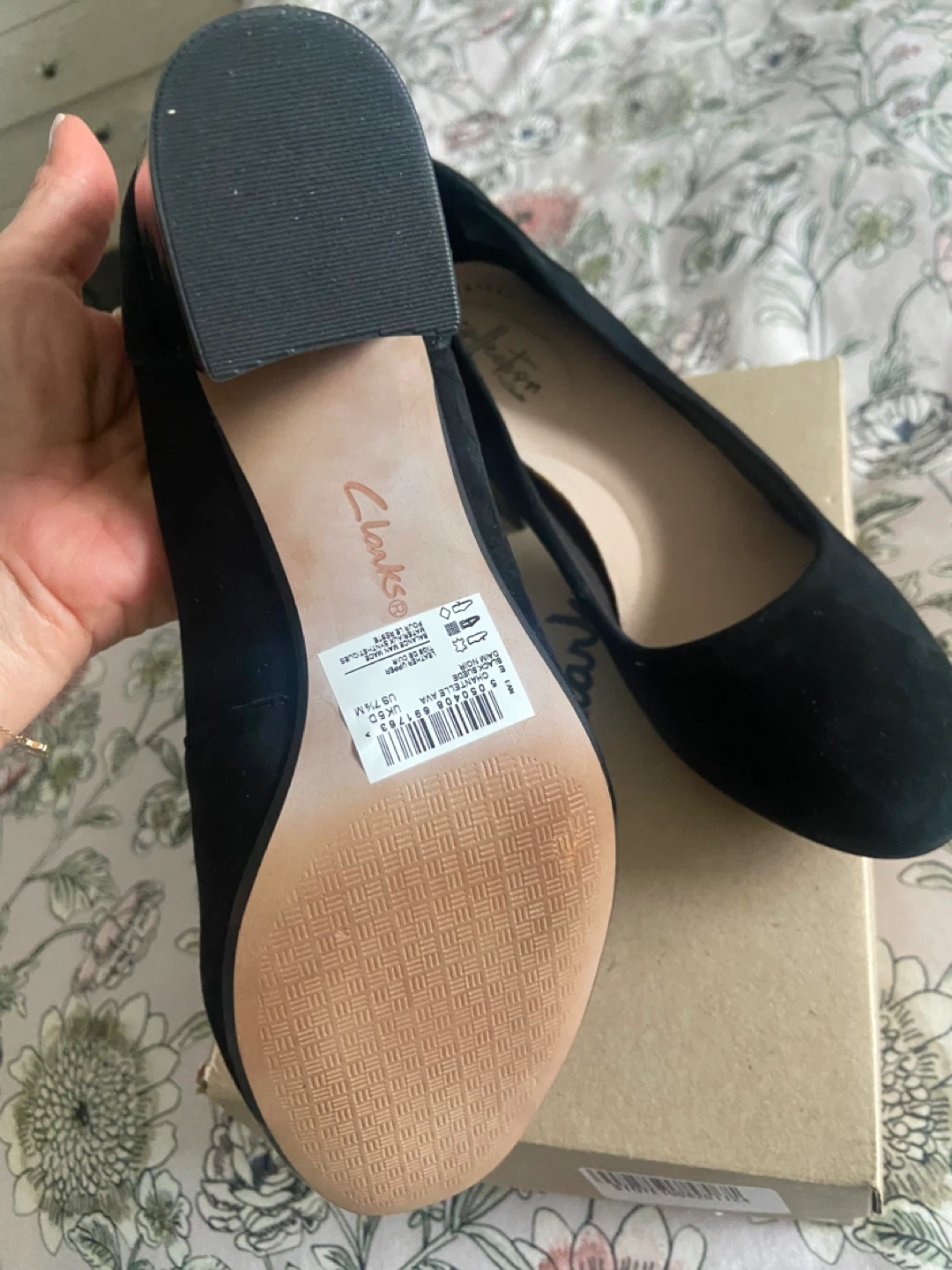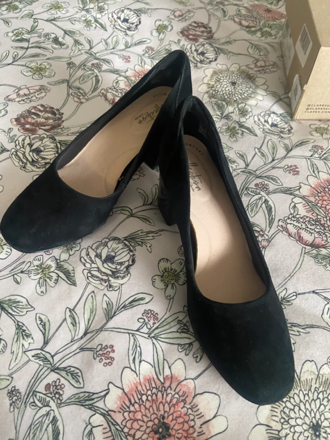 This stunning pair of Clarks Collection heels in black suede are super comfy. The black patten heels add to it’s sophistication without feeling too fancy. Comes with the original box! Never worn.