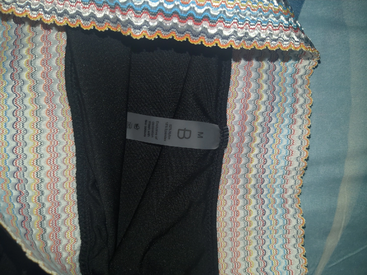 Selling a brand new Blooming Jelly swimsuit in size medium. It's black with a colorful textured band. The tag shows it's made of 82% nylon and 18% spandex