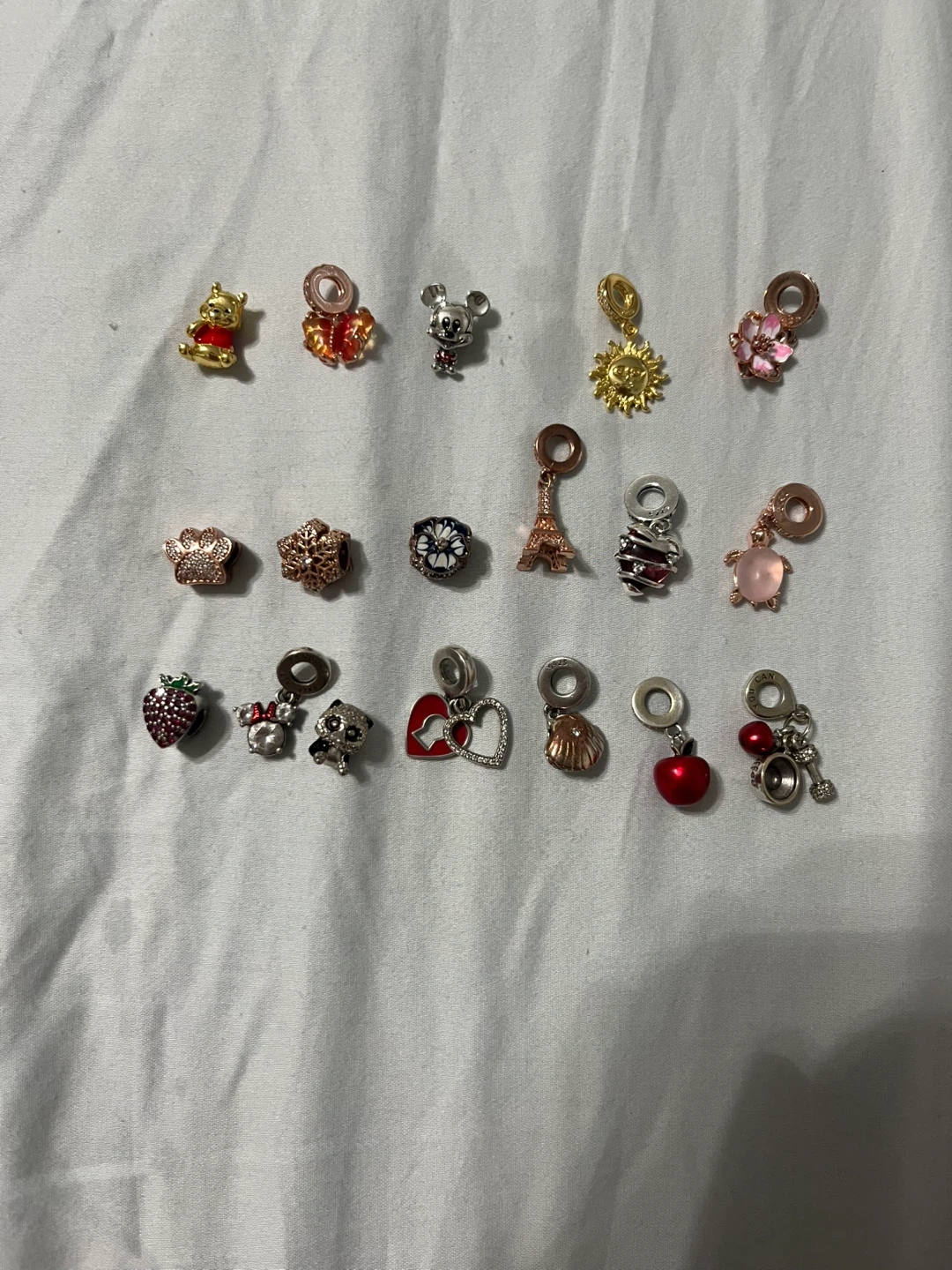 23Selling a collection of Pandora charms! There are a variety of designs, including characters, flowers, and other cute shapes. Perfect for adding some personal flair to your Pandora bracelet!
