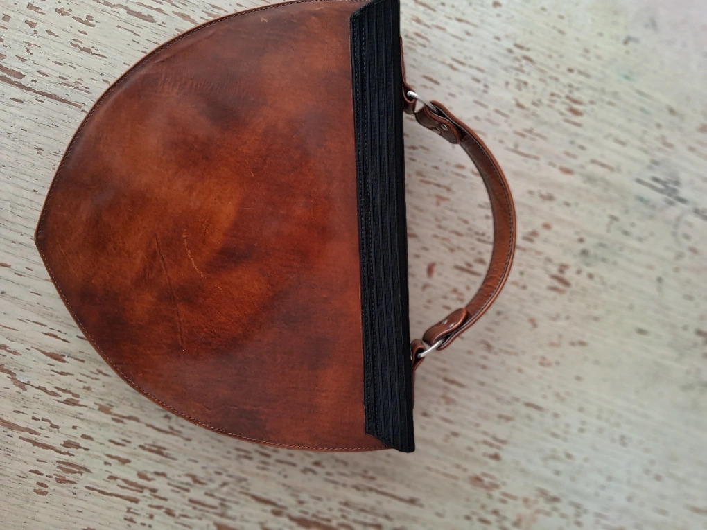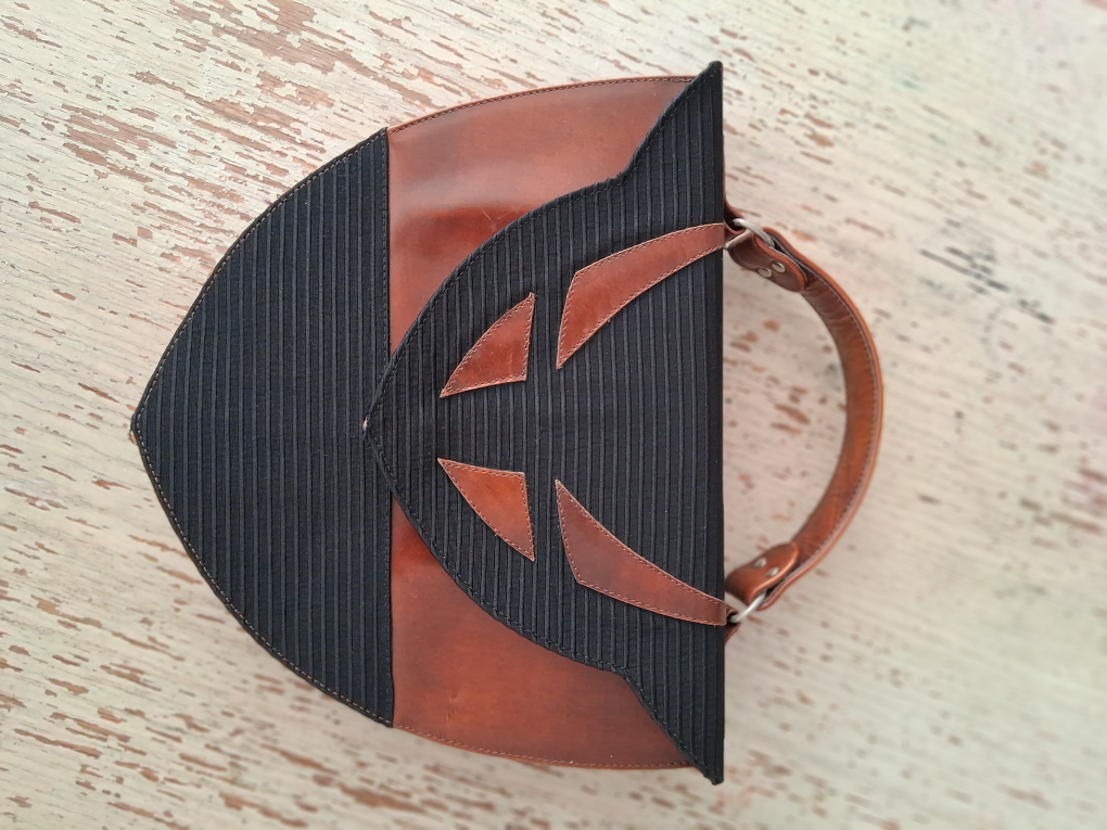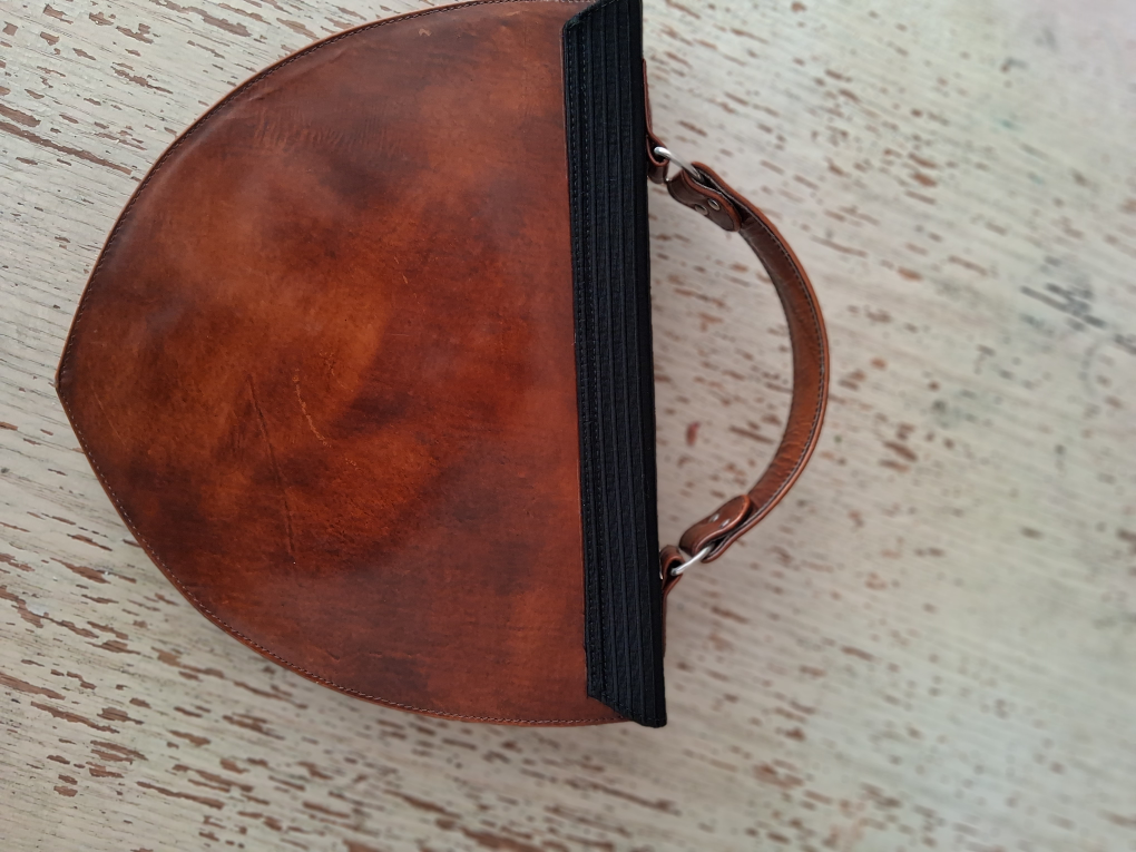 One of kinda Vintage leather handbag! It features a distinctive half-moon shape with a mix of smooth brown leather and textured black fabric. The bag has a handle and a flap closure with buckle detailing. It's in great condition and perfect for business or casual 👍