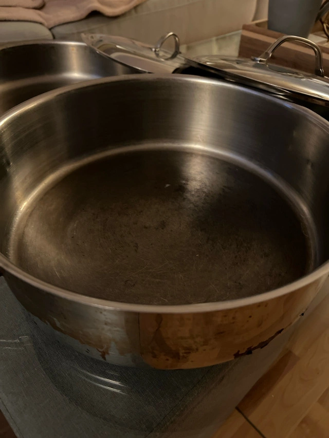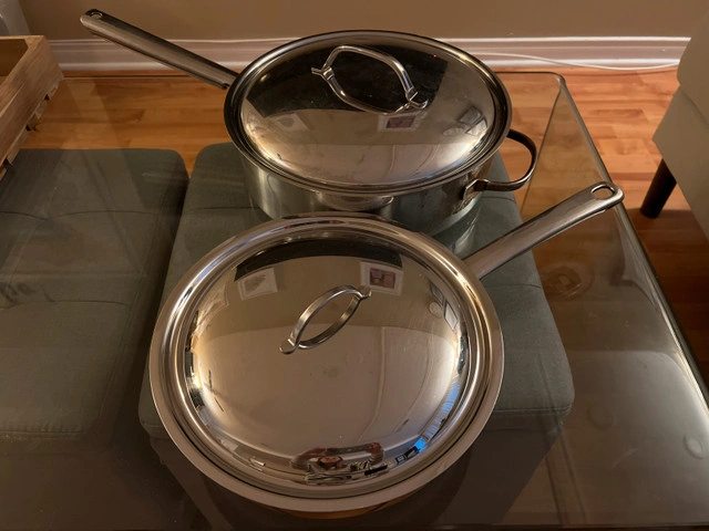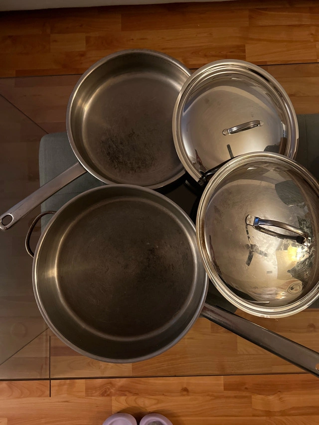 101I'm selling a used stainless steel cookware set, perfect for any kitchen. This set includes a frying pan and a saucepan, each with its own lid. The cookware has been well-used, which is reflected in the price, but they're still in good working condition and ready to cook up your favorite meals. Here are some details: * Material: Stainless Steel * Includes: Frying Pan, Saucepan, and Lids * Condition: Used I'm asking $60 for the set. If you're seeing this ad, that means the cookware set is still available. Happy cooking!