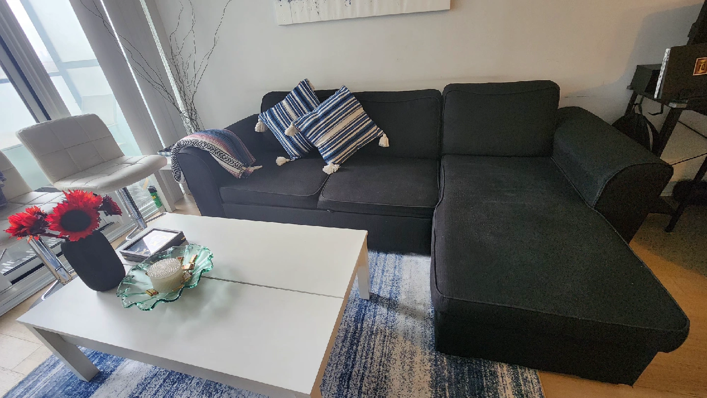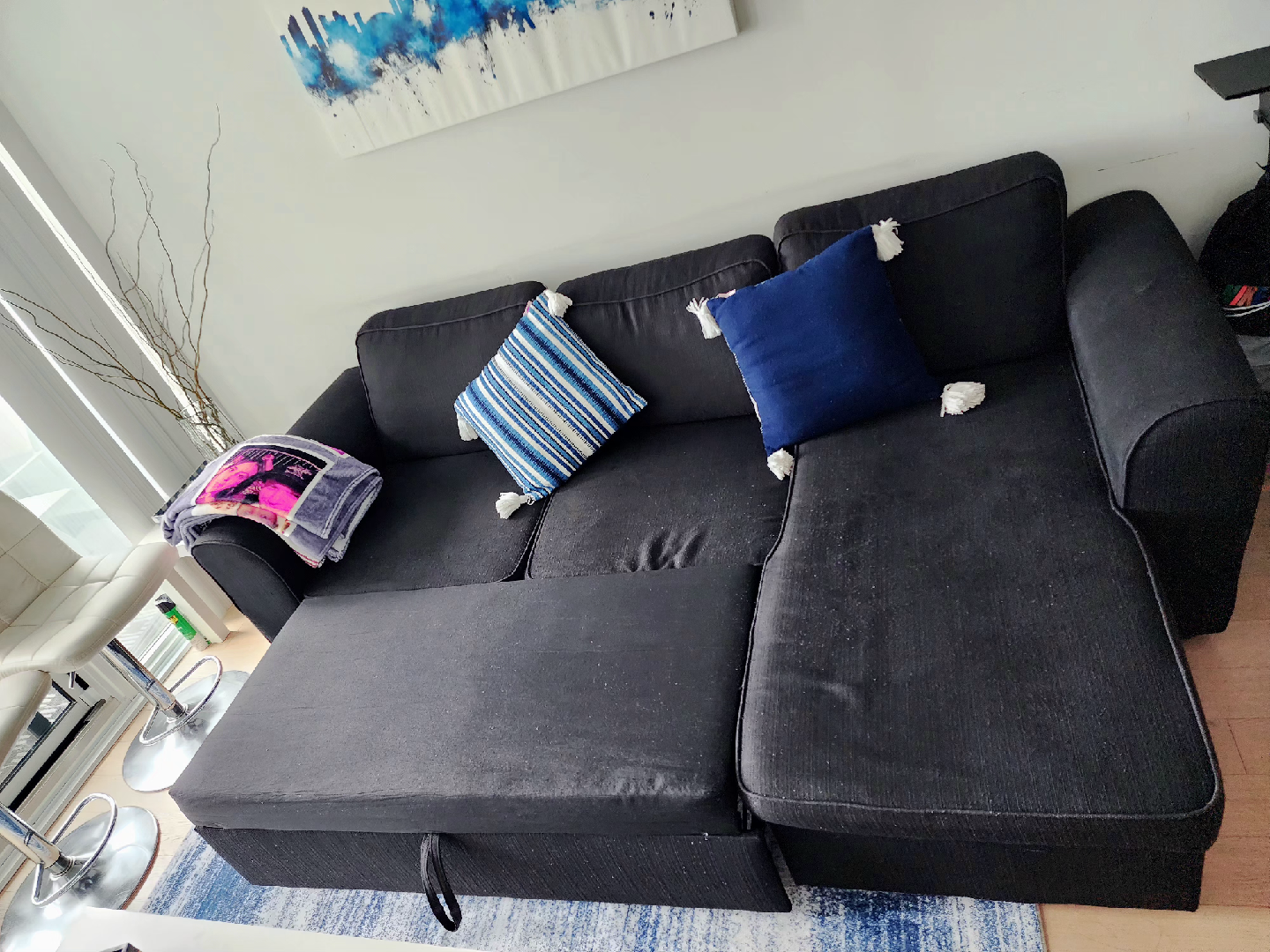 For sale: a comfortable dark grey sofa featuring a chaise lounge. This item is in excellent condition, ideal for unwinding after a demanding day. The chaise provides exceptional comfort for relaxation and entertainment. This versatile piece also converts into a comfortable sofa bed, with all necessary components included. Additionally, it offers substantial integrated storage.