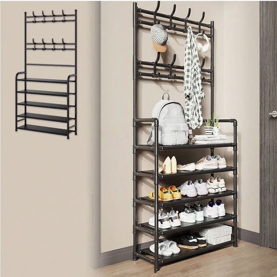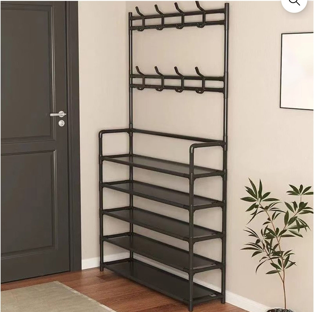 Declutter your entryway with this handy coat rack and shoe organizer! It features multiple shelves for shoes and a rack with hooks for coats, hats, and bags. Perfect for keeping everything tidy and easily accessible