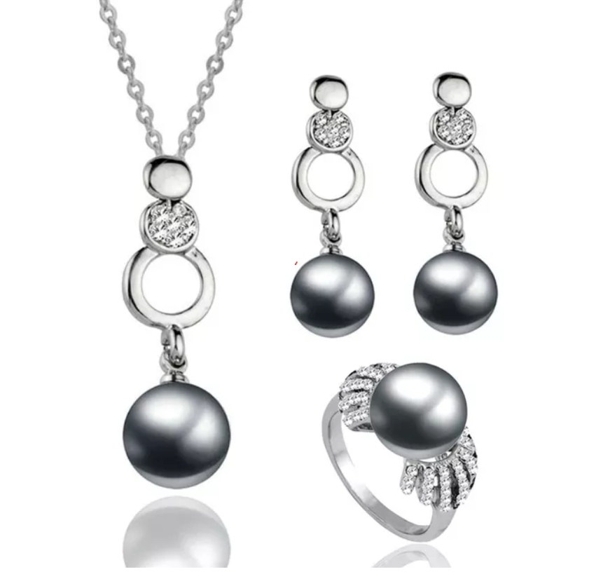 Beautiful pearl jewellery set including a necklace, earrings, and a ring. The set features a necklace with grey pearls and sparkling accents. Perfect for adding a touch of elegance to any outfit!