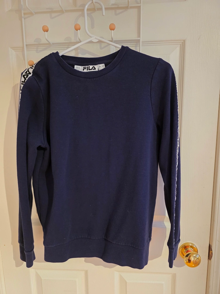 110Selling a Fila sweatshirt in navy blue! It's a size medium and features the Fila logo on the sleeves and chest. Great for casual wear or workouts!