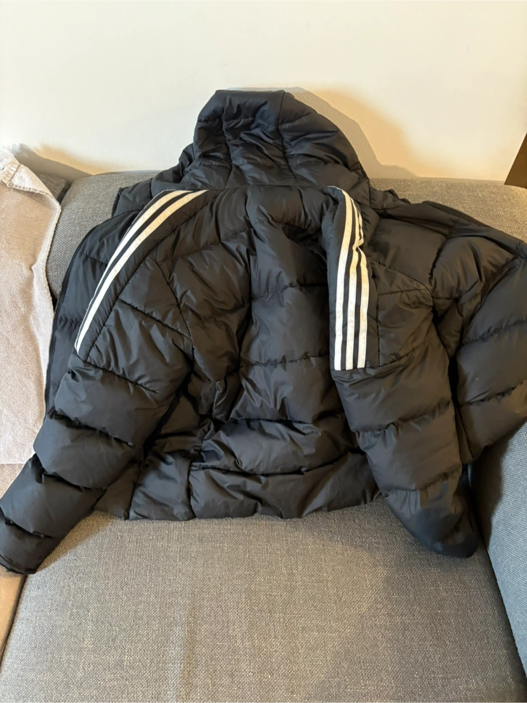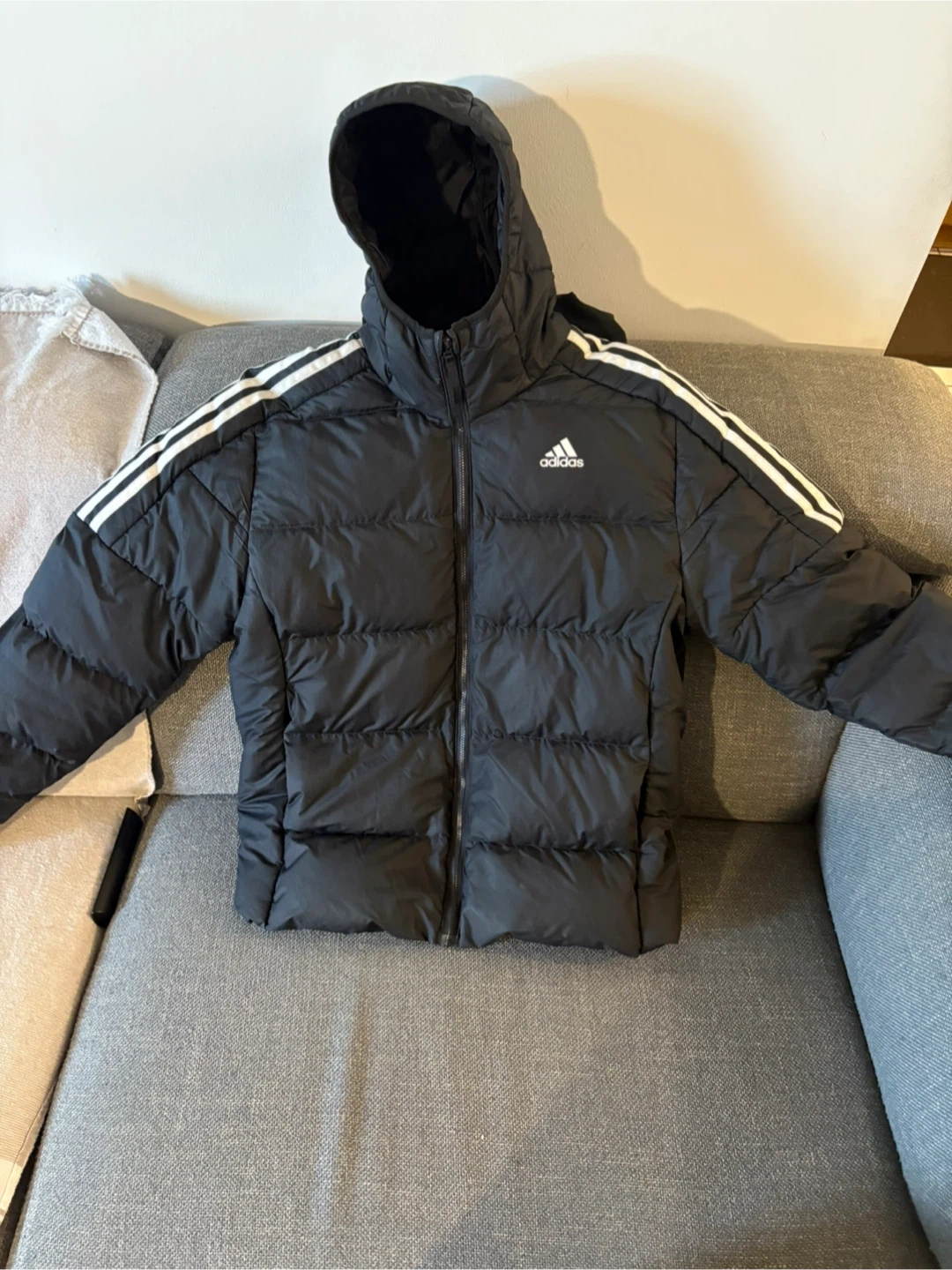 51Selling a gently used Adidas black puffer jacket. It features the classic three stripes design on the sleeves and a hood for extra warmth. Perfect for the Canadian winter weather!