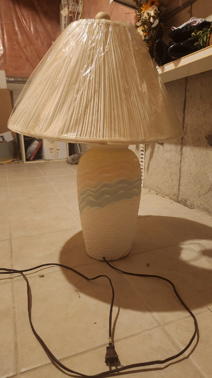 10Selling a cute vintage-style table lamp! It has a unique design with a textured base featuring a wave pattern in pastel colours. The lampshade is pleated and still has its protective plastic covering on it. Perfect for adding a cozy touch to any room!