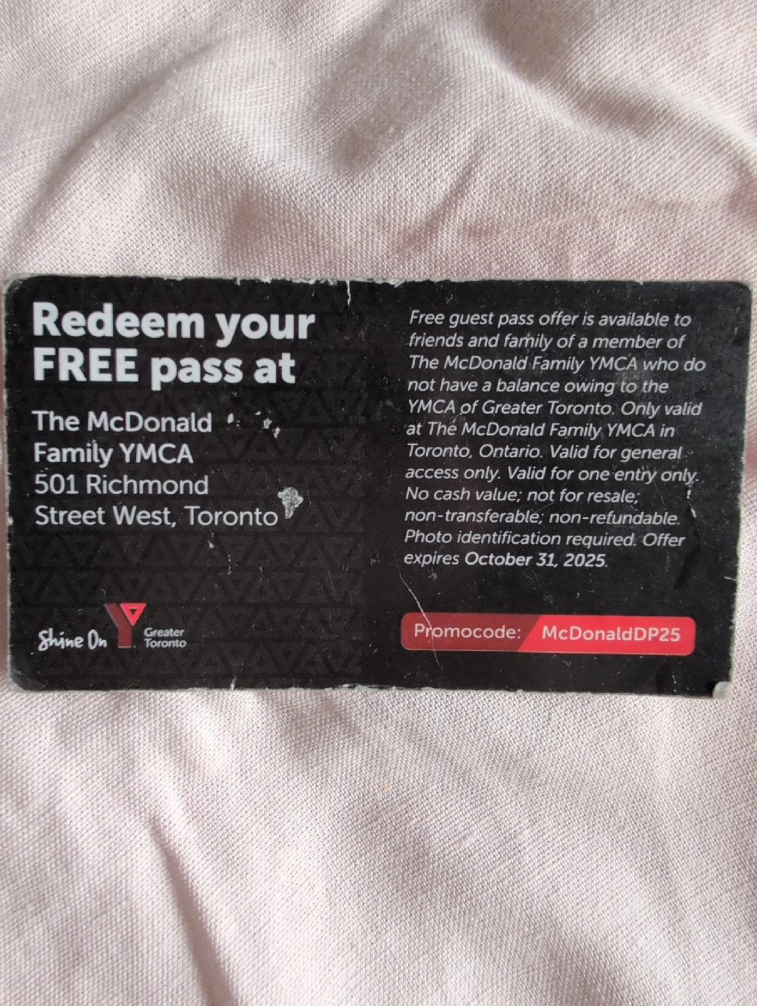 Free guest pass for the McDonald Family YMCA in Toronto! Valid for general access only. Please note the offer expires October 31, 2025. Valid for one entry only and is non-transferable and non-refundable. Photo identification is required.