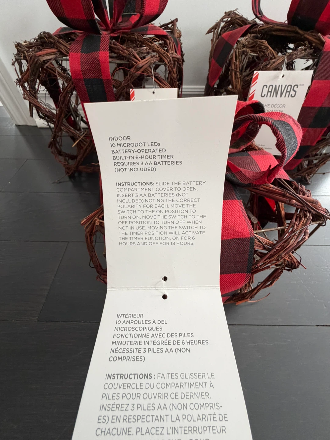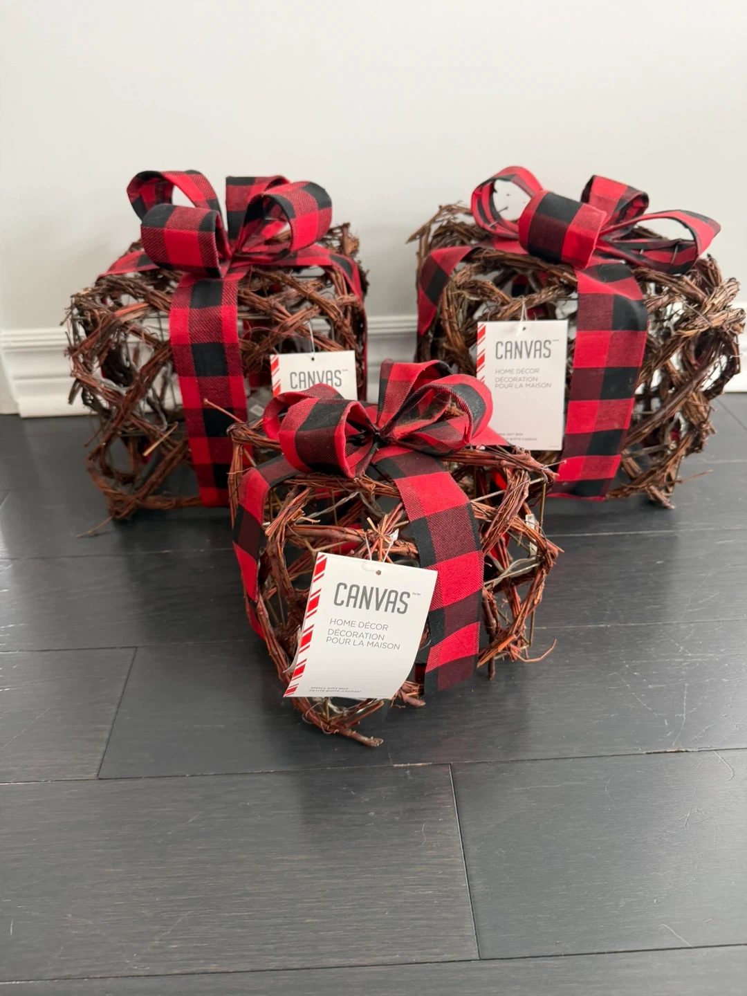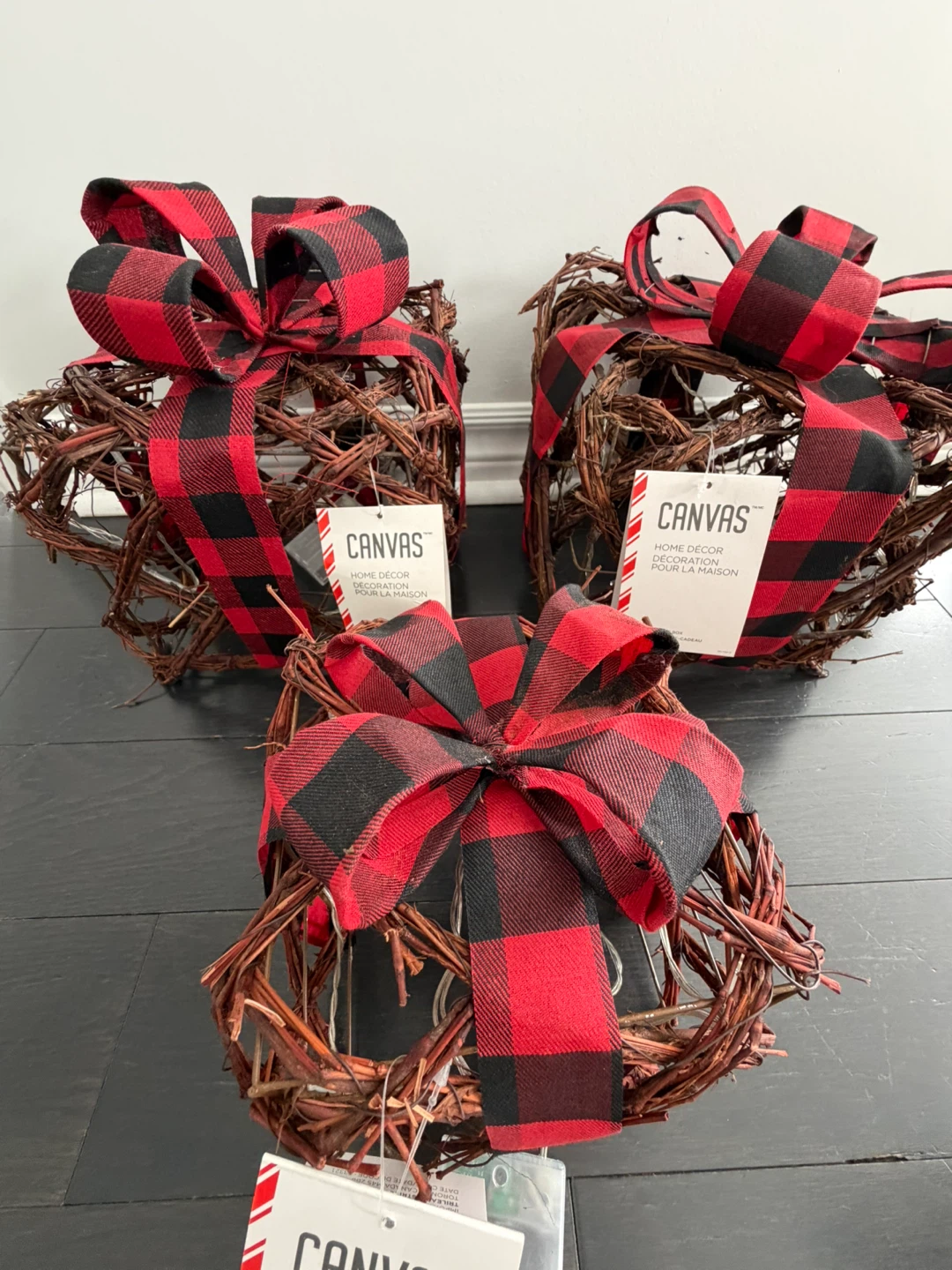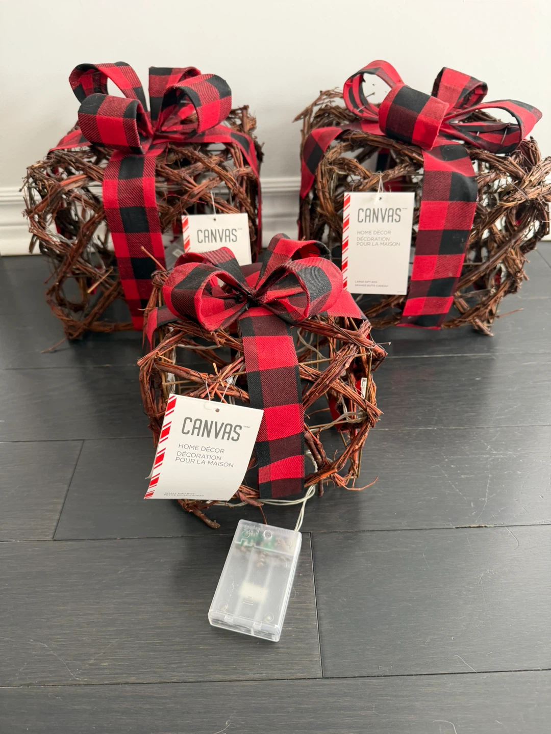 Here's a set of 3 CANVAS home decor pieces. They are adorned with a red and black buffalo plaid bow. Each piece has 10 microdot LEDs and a built-in 6-hour timer. Requires 3 AA batteries (not included)