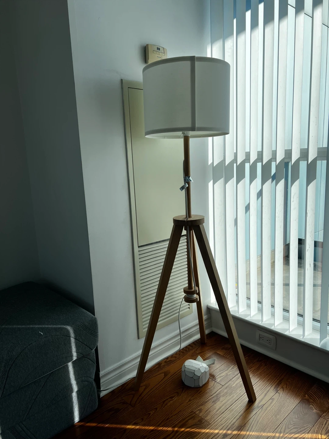 Selling a stylish tripod floor lamp with a wooden base. It's in great condition and would look great in any living room or bedroom. It provides a warm and inviting light