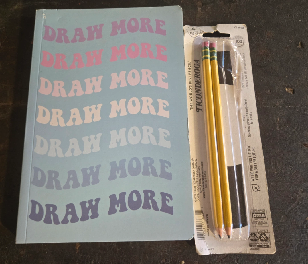 I have a opened pack of Ticonderoga pencils and a notebook that says "Draw More" for free. The pencils are the world's best pencil and are made in Mexico. The package is open and only two remain. The notebook is perfect for writing or drawing and is unused.