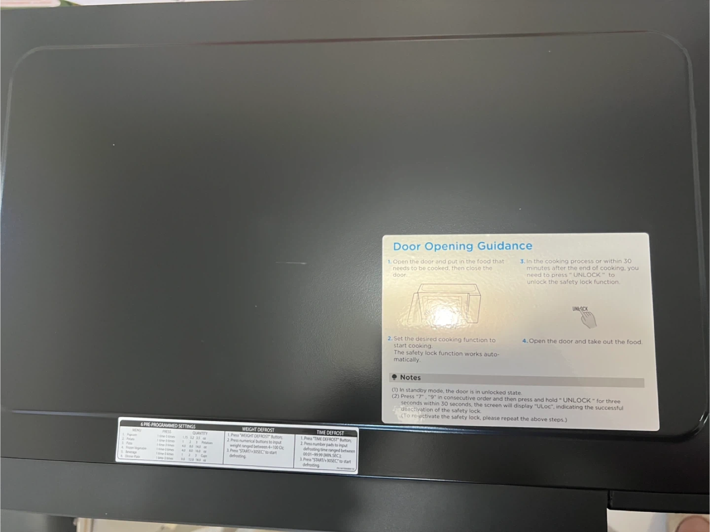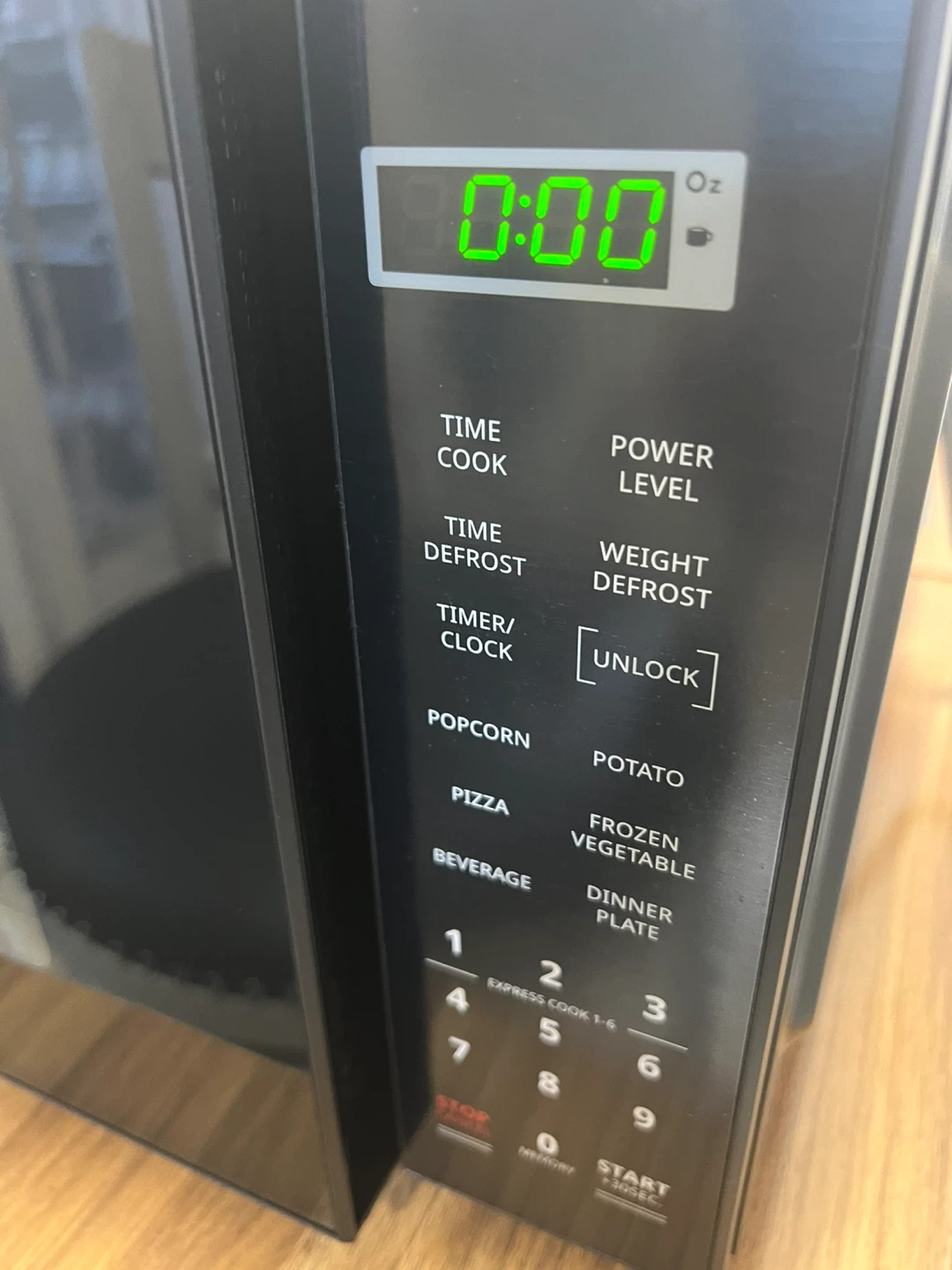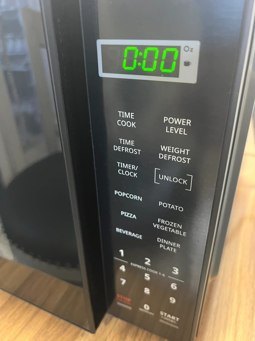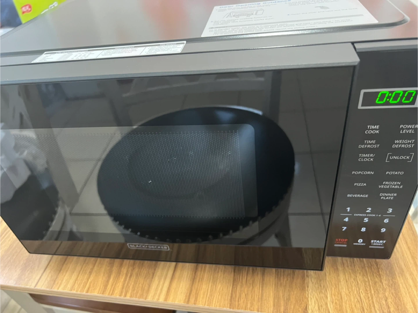 Selling a Black+Decker microwave oven. It has different settings like time cook, power level, time defrost, timer/clock, popcorn, potato, pizza, frozen vegetable, beverage, and dinner plate