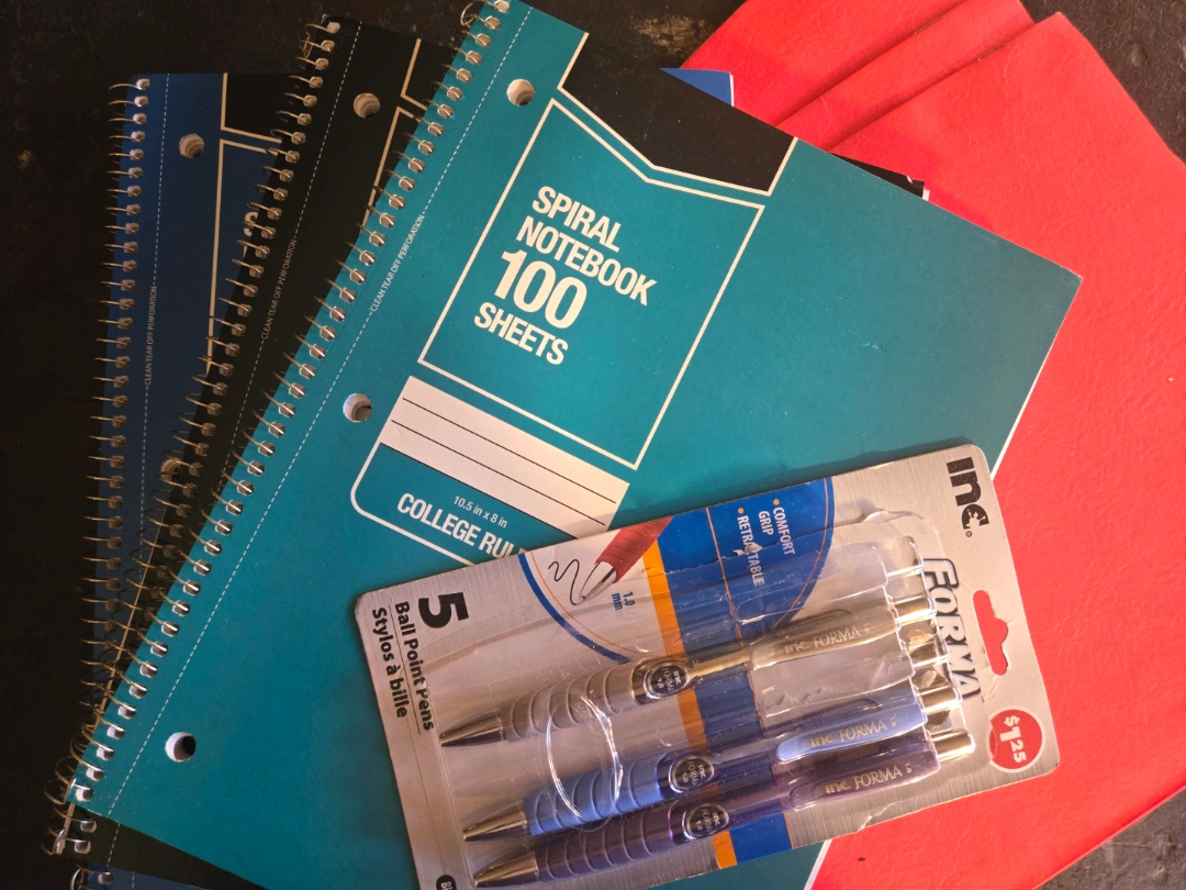 I have 3 spiral notebooks, 3 red folders and 3 Forma ballpoint pens for the taking The notebooks are college ruled and have 100 sheets. The folders are unused, some external marks. The pens are unused, but are in an opened package, they each have a comfort grip and are retractable. Great school suppplies.